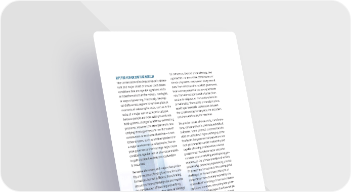 RIPE FOR NEW OR SHIFTING MODELS? tal consensus. Short of a new ideology, new The combination of widespread public discon- approaches—or even more combinations or blends of systems—could occur along several tent and major crises or shocks could create axes, from centralized to localized governance, conditions that are ripe for signi昀椀cant shifts from a strong state role to a strong nonstate or transformations in the models, ideologies, role, from democratic to authoritarian, from or ways of governing. Historically, ideologi- secular to religious, or from nationalist to in- cal shifts across regions have taken place at ternationalist. These shifts or transformations moments of catastrophic crisis, such as in the would spur inevitable contestation between wake of a major war or economic collapse, the constituencies holding onto the old orders because people are more willing to embrace and those embracing the new ones. bold systemic changes to address overarching problems. However, the emergence of a new The precise nature of these shifts, transforma- unifying ideology or system—on the scale of tions, or new models is uncertain and di昀케cult communism or economic liberalism—is rare. to foresee. Some potential outcomes include: Other stresses, such as another pandemic or cities or subnational regions emerging as the a major environmental catastrophe, that ex- focal point for governance if populations see pose governance shortcomings might create local governments as more trustworthy and conditions ripe for new or alternative models capable of solving problems than national to gain traction if widespread dysfunction governments; the private sector and other is sustained. nonstate actors overtaking and displacing gov- Pervasive discontent and major crises proba- ernments as the primary providers of welfare bly are necessary forcing functions for trans- and security; democracy experiencing a revival if it proves more adaptive to the coming global formations but not su昀케cient. Transforming challenges; or the world succumbing to an discontent into something new also requires authoritarian wave partially inspired by Chi- the combination of inspiring and unifying na’s model of technology-driven authoritarian leadership with compelling ideas or ideology capitalism. Moreover, compelling new gover- to build political coalitions and garner socie- nance models or ideologies that have not yet been envisioned or identi昀椀ed could emerge and take hold. A MORE CONTESTED WORLD 89 Image / Bigstock