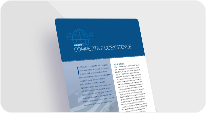 SCENARIO 3 COMPETITIVE COEXISTENCE n 2040, the United States and China have HOW WE GOT THERE prioritized economic growth and restored After a slow recovery from the COVID-19 crisis Ia robust trading relationship, but this and an extended US-China trade war, by the economic interdependence exists alongside late 2020s, pent-up demand and widespread popular frustration with underperforming competition over political in昀氀uence, economies led to a revival in the Organization governance models, technological for Economic Cooperation and Development dominance, and strategic advantage. The (OECD) countries of market-driven economic policies to stimulate growth. Meeting in Cana- risk of major war is low, and international da in 2031, the G7 endorsed plans for econom- cooperation and technological innovation ic stimulus payments, liberalized trade and make global problems manageable over investment, streamlined taxes, and decreased the near term for advanced economies, but regulations. Memories of an overbearing European Union (EU) having faded, Europeans longer term climate challenges remain. agreed to a new round of trade liberalization, somewhat paradoxically under strengthened EU institutions. Weakened by years of de- pressed oil prices, post-Putin Russia supported the new G7 economic consensus, and emerg- ing economies, including Brazil and India, joined with important economic reforms. China rejected the OECD model and adhered to its closed state-directed system but priori- tized economic growth and trade. Beijing and Washington took steps to stabilize economic relations, despite their mutual suspicion and contrasting political-economic models. The relationship has been fraught with disagree- ments on core security issues and values, but seeking relief from the tight trade and investment restrictions of the 2020s led each side to conclude that they need each oth- 114 GLOBAL TRENDS 2040 James Kenny / Unsplash | Macau Photo Agency / Unsplash