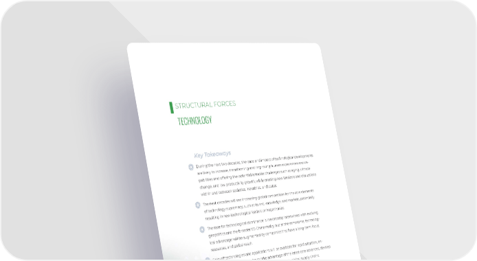 STRUCTURAL FORCES TECHNOLOGY Key Takeaways During the next two decades, the pace and impact of technological developments are likely to increase, transforming and improving human experiences and ca- pabilities and offering the potential to tackle challenges such as aging, climate change, and low productivity growth, while creating new tensions and disruptions within and between societies, industries, and states. The next decades will see increasing global competition for the core elements of technology supremacy, such as talent, knowledge, and markets, potentially resulting in new technological leaders or hegemonies. The race for technological dominance is inextricably intertwined with evolving geopolitics and the broader US-China rivalry, but at the same time, technolog- ical advantage will be augmented by companies that have a long-term focus, resources, and global reach. Spin off technologies and applications will be available for rapid adoption, en- abling developing countries to take advantage of the latest core advances, develop global applications in niche areas, and contribute to global supply chains. 54 Photo / Bigstock