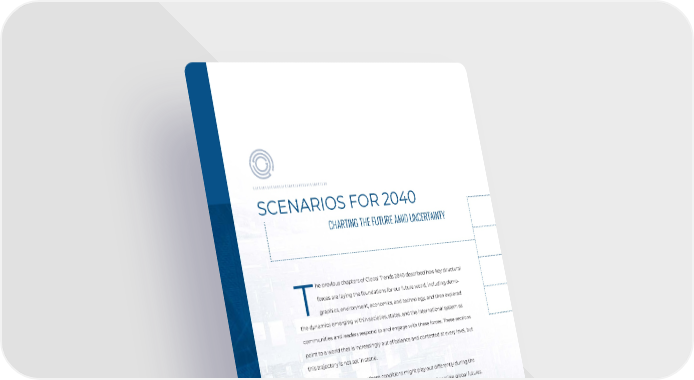 SCENARIOS FOR 2040 CHARTING THE FUTURE AMID UNCERTAINTY he previous chapters of Global Trends 2040 described how key structural forces are laying the foundations for our future world, including demo- Tgraphics, environment, economics, and technology, and then explored the dynamics emerging within societies, states, and the international system as communities and leaders respond to and engage with these forces. These sections point to a world that is increasingly out of balance and contested at every level, but this trajectory is not set in stone. To better understand how these conditions might play out differently during the next 20 years, we developed scenarios describing a range of possible global futures. Three key questions or uncertainties helped to shape these scenarios. • How severe are the looming global challenges? • How do states and nonstate actors engage in the world, including focus and type of engagement? • Finally, what do states prioritize for the future? 108 Image / Bigstock