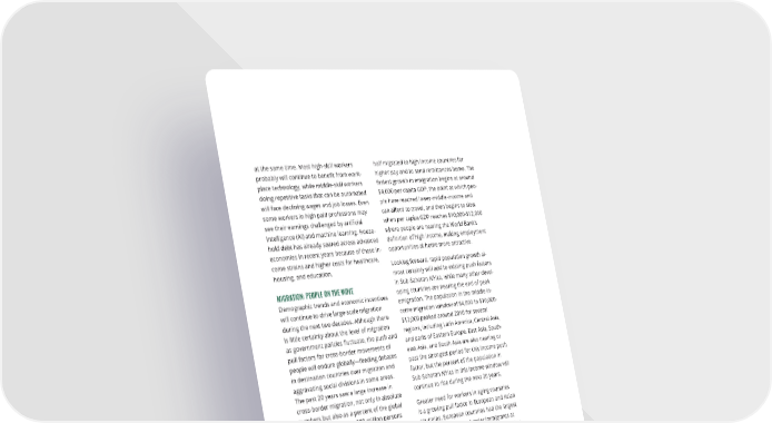 at the same time. Most high-skill workers half migrated to high income countries for probably will continue to bene昀椀t from work- higher pay and to send remittances home. The place technology, while middle-skill workers fastest growth in emigration begins at around doing repetitive tasks that can be automated $4,000 per capita GDP, the point at which peo- will face declining wages and job losses. Even ple have reached lower-middle-income and some workers in high paid professions may can a昀昀ord to travel, and then begins to slow see their earnings challenged by arti昀椀cial when per capita GDP reaches $10,000-$12,000 intelligence (AI) and machine learning. House- where people are nearing the World Bank’s hold debt has already soared across advanced de昀椀nition of high income, making employment economies in recent years because of these in- opportunities at home more attractive. come strains and higher costs for healthcare, Looking forward, rapid population growth al- housing, and education. most certainly will add to existing push factors MIGRATION: PEOPLE ON THE MOVE in Sub-Saharan Africa, while many other devel- Demographic trends and economic incentives oping countries are nearing the end of peak will continue to drive large-scale migration emigration. The population in the middle-in- during the next two decades. Although there come migration window of $4,000 to $10,000- is little certainty about the level of migration $12,000 peaked around 2010 for several regions, including Latin America, Central Asia, as government policies 昀氀uctuate, the push and and parts of Eastern Europe. East Asia, South- pull factors for cross-border movements of east Asia, and South Asia are also nearing or people will endure globally—feeding debates past the strongest period for this income push in destination countries over migration and factor, but the percent of the population in aggravating social divisions in some areas. Sub-Saharan Africa in this income window will The past 20 years saw a large increase in continue to rise during the next 20 years. cross-border migration, not only in absolute numbers but also as a percent of the global Greater need for workers in aging countries population. More than 270 million persons is a growing pull factor in European and Asian in 2020 were living in a country to which countries. European countries had the largest they had migrated, 100 million more than in total number of cross-border immigrants at 2000, representing an increase of more than the end of 2019 at nearly 70 million, according half a percent of the global population. Most to 2020 UN statistics. One-third came from migrants left their homes to pursue better Eastern Europe, which had a working-age economic prospects, but tens of millions were population that was peaking just as advanced 昀氀eeing con昀氀ict, crime, religious and social European economies were beginning to repression, and natural disasters. rapidly age. Aging European countries and Japan are expanding policies that provide visas For the vast majority of migrants who are for workers. workers, migration 昀氀ows clearly re昀氀ect wage di昀昀erentials between countries—the 昀氀ows During the coming 20 years, people 昀氀eeing di- are from smaller, middle-income economies sasters and con昀氀ict will continue to contribute to larger, high-income economies. Almost to migration 昀氀ows. UN and NGO data show two-thirds of migrants in 2019 originated from that domestic civil and political turmoil have middle-income economies, and more than pushed 80 million people out of their homes A MORE CONTESTED WORLD 27
