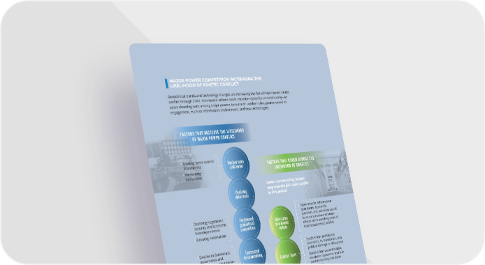 MAJOR POWER COMPETITION INCREASING THE LIKELIHOOD OF KINETIC CONFLICT Geopolitical trends and technology changes are increasing the risk of major power kinetic conflict through 2040. Non-kinetic actions could escalate—possibly unintentionally—to active shooting wars among major powers because of weaker rules, greater speed of engagement, murkier information environment, and new technologies. FACTORS THAT INCREASE THE LIKELIHOOD OF MAJOR POWER CONFLICT > Eroding arms control Unclear rules frameworks and norms FACTORS THAT COULD REDUCE THE > Weakening LIKELIHOOD OF CONFLICT institutions Some countervailing factors Declining may restrain full-scale conflict deterrence in this period. > Cyber attacks, information > Declining hegemonic Heightened operations, economic coercion, and precision use of security and economic geopolitical Alternative interdependence competition non-kinetic force can produce strategic > Growing nationalism options effects while avoiding costs of traditional armed conflict > Decline in democratic Centralized > Leaders fear prohibitive governance and decisionmaking economic, humanitarian, and political damage or disruption increased authoritarian Leaders’ fears and personalist rule > Leaders fear uncontrollable escalation dynamics and lack confidence they can deter > Technological change Long-range retaliation and accelerated pace weapons of warfare advancements > Absent major technological > AI decisionmaking Survivable 2nd change, potent nuclear strike capability arsenals will leave deterrence intact; nuclear war will remain unwinnable > Misinformation and Murkier and prohibitively costly disinformation information overtakes or distorts environment objective truth A MORE CONTESTED WORLD 103