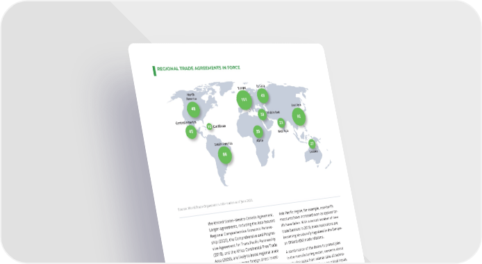 REGIONAL TRADE AGREEMENTS IN FORCE Europe Eurasia North 48 America 101 48 East Asia 30 Middle East Central America 92 40 10 Caribbean 23 35 West Asia South America Africa 66 27 Oceania Source: World Trade Organization. Information as of June 2020. the United States–Mexico-Canada Agreement. Asia Paci昀椀c region, for example, non-tari昀昀s Larger agreements, including the Asia-focused measures have increased even as applied tar- Regional Comprehensive Economic Partner- i昀昀s have fallen. With a record number of new ship (2020), the Comprehensive and Progres- trade barriers in 2019, trade restrictions are sive Agreement for Trans Paci昀椀c Partnership becoming structurally ingrained in the Europe- (2018), and the Africa Continental Free Trade an Union’s (EU) trade relations. Area (2020), are likely to boost regional trade and could attract more foreign direct invest- A combination of the desire to protect jobs ment to these regions. in the manufacturing sector, concerns about capturing gains from winner-take-all techno- Expanding unilateral, often non-tari昀昀 trade logical progress, and a focus on critical inputs, restrictions, are likely to further complicate such as medical equipment and pharmaceu- international trade for governments and the tical feedstocks, is likely to further accelerate private sector, limit trade-driven economic the use of protectionist trade policies. The growth, and weaken overall growth. Although anticipated increase in job losses in manufac- the US-China trade war has garnered head- turing during the next two decades is likely to lines, many countries have increased their use place pressure on governments, particularly of restrictive trade measures during the past those in advanced and manufacturing-depen- 12 years. Between 2008 and 2018, the number dent emerging economies, to take protective of restrictive trade-related policy measures actions. In addition, a recognition that technol- implemented globally increased by more than ogies, such as AI, could lead to sustainable 昀椀rst 200 percent compared to the previous decade, mover advantages—in which being the 昀椀rst to with Latin America and Asia accounting for 30 market a new product provides a competitive percent and 40 percent respectively. In the advantage—might lead some governments to 48 GLOBAL TRENDS 2040