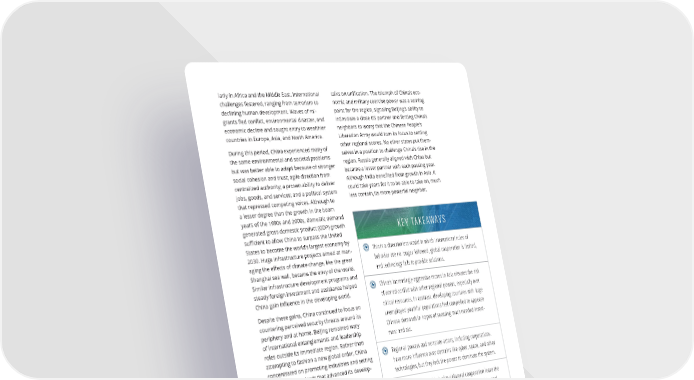 larly in Africa and the Middle East. International talks on uni昀椀cation. The triumph of China’s eco- challenges festered, ranging from terrorism to nomic and military coercive power was a turning declining human development. Waves of mi- point for the region, signaling Beijing’s ability to grants 昀氀ed con昀氀ict, environmental disaster, and intimidate a close US partner and forcing China’s economic decline and sought entry to wealthier neighbors to worry that the Chinese People’s countries in Europe, Asia, and North America. Liberation Army would turn its focus to settling During this period, China experienced many of other regional scores. No other states put them- the same environmental and societal problems selves in a position to challenge China’s rise in the but was better able to adapt because of stronger region. Russia generally aligned with China but social cohesion and trust; agile direction from became a lesser partner with each passing year. centralized authority; a proven ability to deliver Although India bene昀椀ted from growth in Asia, it could take years for it to be able to take on, much jobs, goods, and services; and a political system less contain, its more powerful neighbor. that repressed competing voices. Although to a lesser degree than the growth in the boom years of the 1990s and 2000s, domestic demand generated gross domestic product (GDP) growth KEY TAKEAWAYS su昀케cient to allow China to surpass the United States to become the world’s largest economy by 2030. Huge infrastructure projects aimed at man- This is a directionless world in which international rules of behavior are no longer followed, global cooperation is limited, aging the e昀昀ects of climate change, like the great Shanghai sea wall, became the envy of the world. and technology fails to provide solutions. Similar infrastructure development programs and steady foreign investment and assistance helped China’s increasingly aggressive moves in Asia elevates the risk China gain in昀氀uence in the developing world. of armed conflict with other regional powers, especially over Despite these gains, China continued to focus on critical resources. In contrast, developing countries with large countering perceived security threats around its unemployed youthful populations feel compelled to appease periphery and at home. Beijing remained wary Chinese demands in hopes of securing much needed invest- of international entanglements and leadership ment and aid. roles outside its immediate region. Rather than attempting to fashion a new global order, China Regional powers and nonstate actors, including corporations, concentrated on promoting industries and setting have more influence over domains like cyber, space, and other technology standards that advanced its develop- technologies, but they lack the power to dominate the system. ment goals. Many governments were content to pro昀椀t from Weakened rules and lack of multilateral cooperation leave the China’s large market and to pocket other bene昀椀ts, world more vulnerable to individual hackers, terrorists, and like Chinese assistance with domestic surveillance criminal groups. Belligerents feel emboldened to pursue their and security systems, but few wanted to live goals with force, particularly in the Middle East and Africa. under a China-led international order. The United States attempted to preserve ties to remaining Large global problems, particularly climate change and health allies in the region, but Japan and South Korea pursued increasingly independent military mod- challenges, fester as states lack incentives to pursue collec- ernization programs and even their own nuclear tive actions and instead apply a patchwork of mismatched weapons programs, in part out of concern about approaches. Nonetheless, some states, companies, and the reliability of the US security umbrella against private organizations use the freedom to discover novel ways China and North Korea. to enhance human health and worker productivity and to By 2035, China’s position in Asia became unassail- experiment with new approaches to economic development able, especially after it successfully compelled the and governance. Government of Taiwan to come to the table for Photo / Bigstock A MORE CONTESTED WORLD 113