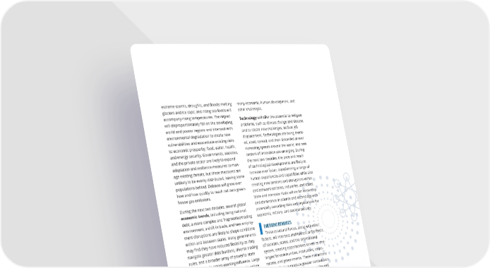extreme storms, droughts, and 昀氀oods; melting many economic, human development, and glaciers and ice caps; and rising sea levels will other challenges. accompany rising temperatures. The impact Technology will o昀昀er the potential to mitigate will disproportionately fall on the developing problems, such as climate change and disease, world and poorer regions and intersect with environmental degradation to create new and to create new challenges, such as job vulnerabilities and exacerbate existing risks displacement. Technologies are being invent- to economic prosperity, food, water, health, ed, used, spread, and then discarded at ever and energy security. Governments, societies, increasing speeds around the world, and new and the private sector are likely to expand centers of innovation are emerging. During adaptation and resilience measures to man- the next two decades, the pace and reach age existing threats, but these measures are of technological developments are likely to unlikely to be evenly distributed, leaving some increase ever faster, transforming a range of populations behind. Debates will grow over human experiences and capabilities while also how and how quickly to reach net zero green- creating new tensions and disruptions within house gas emissions. and between societies, industries, and states. State and nonstate rivals will vie for leadership During the next two decades, several global and dominance in science and technology with economic trends, including rising national potentially cascading risks and implications for debt, a more complex and fragmented trading economic, military, and societal security. environment, a shift in trade, and new employ- ment disruptions are likely to shape conditions EMERGING DYNAMICS within and between states. Many governments These structural forces, along with other may 昀椀nd they have reduced 昀氀exibility as they factors, will intersect and interact at the levels navigate greater debt burdens, diverse trading of societies, states, and the international rules, and a broader array of powerful state system, creating opportunities as well as chal- and corporate actors exerting in昀氀uence. Large lenges for communities, institutions, corpo- platform corporations—which provide online rations, and governments. These interactions markets for large numbers of buyers and sell- are also likely to produce greater contestation er—could drive continued trade globalization at all levels than has been seen since the end and help smaller 昀椀rms grow and gain access of the Cold War, re昀氀ecting di昀昀ering ideolo- to international markets. These powerful 昀椀rms gies as well as contrasting views on the most are likely to try to exert in昀氀uence in political e昀昀ective way to organize society and tackle and social arenas, e昀昀orts that may lead gov- emerging challenges. ernments to impose new restrictions. Asian Within societies, there is increasing fragmen- economies appear poised to continue decades tation and contestation over economic, cultur- of growth through at least 2030, although po- al, and political issues. Decades of steady gains tentially slower. They are unlikely to reach the in prosperity and other aspects of human de- per capita gross domestic product (GDP) or velopment have improved lives in every region economic in昀氀uence of existing advanced econ- and raised peoples’ expectations for a better omies, including the United States and Europe. future. As these trends plateau and combine Productivity growth remains a key variable; an with rapid social and technological changes, increase in the rate of growth could alleviate A MORE CONTESTED WORLD 7 Image / Bigstock