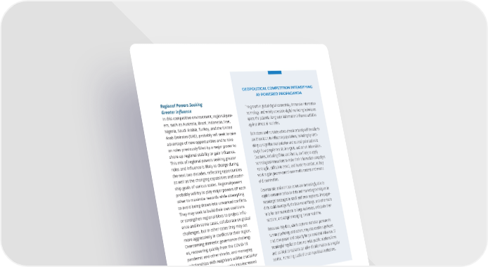 GEOPOLITICAL COMPETITION INTENSIFYING AI-POWERED PROPAGANDA Regional Powers Seeking The growth in global digital connectivity, immersive information Greater In昀氀uence In this competitive environment, regional pow- technology, and widely accessible digital marketing techniques ers, such as Australia, Brazil, Indonesia, Iran, opens the potential for greater information influence activities Nigeria, Saudi Arabia, Turkey, and the United against almost all societies. Arab Emirates (UAE), probably will seek to take Both states and nonstate actors almost certainly will be able to advantage of new opportunities and to take use these tools to influence populations, including by ratch- on roles previously 昀椀lled by a major power to eting up cognitive manipulation and societal polarization to shore up regional stability or gain in昀氀uence. shape how people receive, interpret, and act on information. This mix of regional powers seeking greater Countries, including China and Russia, are likely to apply roles and in昀氀uence is likely to change during technological innovations to make their information campaigns the next two decades, re昀氀ecting opportunities more agile, difficult to detect, and harder to combat, as they as well as the changing capabilities and leader- work to gain greater control over media content and means ship goals of various states. Regional powers of dissemination. probably will try to play major powers o昀昀 each other to maximize rewards while attempting Governments and nonstate actors are increasingly able to exploit consumer behavior data and marketing techniques to to avoid being drawn into unwanted con昀氀icts. They may seek to build their own coalitions microtarget messages to small audience segments. Propagan- or strengthen regional blocs to project in昀氀u- dists could leverage AI, the Internet of Things, and other tools ence and in some cases, collaborate on global to tailor communications to large audiences, anticipate their challenges, but in other cases they may act reactions, and adapt messaging in near real time. more aggressively in con昀氀icts in their region. Behavioral big data, which captures statistical patterns in Overcoming domestic governance challeng- human psychology and action, may also enable significant es, recovering quickly from the COVID-19 predictive power and capacity for personalized influence. If pandemic and other shocks, and managing meaningful regulation does not exist, public relations firms relationships with neighbors will be crucial for and political consultants can offer disinformation as a regular converting their key strengths into increased service, increasing public distrust in political institutions. in昀氀uence. Some probably will play crucial roles in tackling challenges at the regional level including nonstate actor security threats, ter- rorism, mass migration, and digital privacy. can shape or constrain state actions through Nonstate Actors Powerful, In昀氀uential lobbying leaders and mobilizing citizens. The Nonstate actors, such as NGOs, religious in昀氀uence of nonstate actors will vary and be groups, and technology superstar 昀椀rms, will subject to government intervention. China, the have the resources and global reach to build EU, and others are already moving to regu- and promote alternative networks that com- late or break up superstar 昀椀rms, while Beijing plement, compete with, or possibly bypass is trying to control or suppress NGOs and states. In the past several decades, nonstate religious organizations. Many nonstate actors actors and transnational movements have are likely to try to push back on state e昀昀orts used growing international connections for to consolidate sovereignty in newer frontiers, collective action or to in昀氀uence populations including cyberspace and space. around the world. In some cases, these actors A MORE CONTESTED WORLD 97