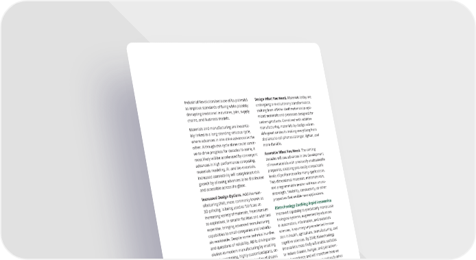Industrial Revolution because of its potential Design What You Need. Materials today are to improve standards of living while possibly undergoing a revolutionary transformation, disrupting traditional industries, jobs, supply shifting from o昀昀-the-shelf materials to opti- chains, and business models. mized materials and processes designed for Materials and manufacturing are inextrica- custom products. Combined with additive bly linked in a long-standing virtuous cycle, manufacturing, materials-by-design will en- where advances in one drive advances in the able great strides in making everything from other. Although this cycle alone could contin- airplanes to cell phones stronger, lighter, and ue to drive progress for decades to come, it more durable. most likely will be accelerated by convergent Assemble What You Need. The coming advances in high performance computing, decades will see advances in the development materials modeling, AI, and bio-materials. of new materials with previously unobtainable Increased connectivity will complement this properties, enabling previously unreachable growth by allowing advances to be distributed levels of performance for many applications. and accessible across the globe. Two-dimensional materials, metamaterials, Increased Design Options. Additive man- and programmable matter will have unusu- ufacturing (AM), more commonly known as al strength, 昀氀exibility, conductivity, or other 3D printing, is being used to fabricate an properties that enable new applications. increasing variety of materials, from titanium Biotechnology Enabling Rapid Innovation to explosives, in smaller facilities and with less Improved capability to predictably manipulate expertise, bringing advanced manufacturing biological systems, augmented by advances capabilities to small companies and individu- in automation, information, and materials als worldwide. Despite some technical hurdles sciences, is spurring unprecedented innova- and questions of reliability, AM is driving a rev- tion in health, agriculture, manufacturing, and olution in modern manufacturing by enabling cognitive sciences. By 2040, biotechnology rapid prototyping, highly customized parts, on- innovations most likely will enable societies site production, and the fabrication of shapes to reduce disease, hunger, and petrochem- that would otherwise be impossible. ical dependence and will transform how we Adapting On The Fly. Advances in informa- interact with the environment and each other. tion systems, including computational mod- Societies will be challenged to harness these eling and machine learning, combined with bene昀椀cial advancements while addressing the advanced physical systems, such as a robust market, regulatory, safety, and ethical con- industrial Internet of Things and advanced cerns surrounding these technologies—for ex- robotics, are likely to enable fully integrated, ample, genetically modi昀椀ed crops and foods. collaborative manufacturing systems that Biotechnology is likely to make signi昀椀cant con- respond in real time to meet changing condi- tributions to economic growth during the next tions in the factory, in the supply network, and two decades, potentially a昀昀ecting 20 percent in demand. of global economic activity by 2040, notably in agriculture and manufacturing, based on 60 GLOBAL TRENDS 2040