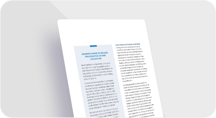 Arms Control and Treaties on the Brink Existing norms and treaties governing the GROWING CHANCE OF NUCLEAR use of arms and conduct of war are increas- PROLIFERATION OR EVEN ingly contested, and new understandings are NUCLEAR USE lagging behind technological innovations. Repeated and unpunished violations of rules and norms on nonviolability of borders, assas- Nuclear proliferation and potentially nuclear use are sination, and use of certain prohibited weap- more likely in this competitive geopolitical environ- ons, like chemical weapons, are shifting actors’ ment. Advances in technology and diversification of de- livery systems, arms control uncertainties, and spread cost-bene昀椀t analysis in favor of their use. Renewed competition, accusations of cheating, of knowledge and skills related to nuclear technology and the suspension or non-renewal of several add to the higher risk. major agreements are likely to weaken stra- Countries that have declared their nuclear weapons tegic arms control structures and undermine are adding to or upgrading their arsenals; China and nonproliferation. Russia are investing in new delivery vehicles includ- Reaching agreement on new treaties and ing missiles, submarines, bombers, and hypersonic norms for certain weapons most likely will be weapons. These states are likely to continue to field increasingly accurate, lower yield nuclear weapons on more di昀케cult for these reasons and because of the increasing number of actors possessing platforms intended for battlefield use, which could en- these weapons. Weapons considered to have courage states to consider nuclear use in more instanc- strategic impact probably will no longer be es with doctrines that differentiate between large-scale nuclear exchanges and “limited use” scenarios. con昀椀ned to nuclear weapons as conventional weapon capabilities improve and new capa- Perceived external security threats are increasing in bilities, such as long-range precision strike many regions, particularly the Middle East and Asia, that could put at risk national leadership, o昀昀er which is a key factor in states’ decision to develop powerful e昀昀ects. Countries may struggle to nuclear weapons, according to academic research. reach agreement on limiting the disruptive or Growing questions about security guarantees, extend- security aspects of AI and other technology ed deterrence, and heightened regional pressures because of de昀椀nitional di昀昀erences, dual-use could lead some advanced economies to acquire or commercial applications, and reliance on build their own programs. commercial and often international entities to develop new systems. Incentives for such rules and enforcement mechanisms could emerge over time, especially if crises unfold that show- case the big risks and costs of unrestrained arms development. 106 GLOBAL TRENDS 2040