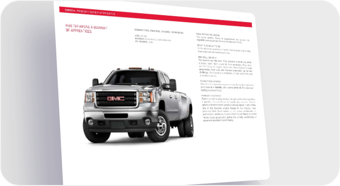 SIERRA: PRODUCT/BUYER ATTRIBUTES MASTER AMONG A SEGMENT COMMITTED, PROVEN, LEADER, POWERFUL ROLE WITHIN THE BRAND OF APPRENTICES The brand anchor. Sierra is experienced and proven; its AGE: 25-54 capability and power set the tone for the rest of GMC. GENDER: 80% MALE, 20% FEMALE HH INCOME: 60K+ WHAT IT IS BUILT TO DO Be the ultimate expression of professional-grade engineering from engineers who never say never. WHO WILL DRIVE IT The leaders and the best. They possess a never-say-never attitude; “can’t” isn’t a word in their vocabulary. They don’t wait for things to happen, they make them happen through preparation, hard work and flawless execution. Up for any challenge, their truck is a reflection of their work ethic and attention to detail. PERCEPTUAL SPACES Sierra has the same strong presence on the toughest job sites as it does at a meeting with clients (after all, it is the best- looking truck out there). PRODUCT FEATURES Sierra’s exterior styling conveys strength, power and capability; it provides the confidence to handle any situation. Sierra’s spacious interior boasts generous storage space. It also offers one of the broadest engine lineups in the industry, from job-ready Work Truck models to the unique combination of performance and luxury found in Sierra Denali. Sierra’s powerful Vortec-based powertrains deliver the unlikely combination of power and excellent fuel efficiency.