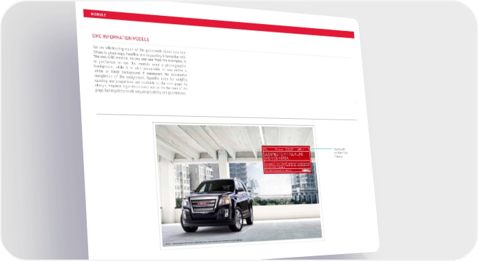 MODULE GMC INFORMATION MODULE We are eliminating much of the guesswork about how and Where to place copy, headline and supporting information with The new GMC module. As you can see from the examples, it is preferred to run the module over a photographic background, while it is also acceptable to use either a white or black background if necessary for successful completion of the assignment. Specific rules for weights, spacing and proportions are available on the next page. As always, required legal disclosures run at the bottom of the page, but regulations will vary on proximity and prominence. , MODEL Mpg rEar LEg rOOM cargO TE„„…I† CIT‰Ž Œ‘‰ ‹.‹ I†CŒE “.‹ C‚ FT CONTAINED ‡EIG†E‡ Tˆ FIT ‰ˆ‚„ ŠIFE INFORMATION … † ‡ ƒICE ƒE„…. MODULE Every inch of the GMC Terrain was engineered to integrate into your life. Its MultiFlex seating offers endless flexibility for any kind of cargo. The standard rear-vision caera hels you see what’s behind you while its g hwy hels you kee an eye on your ocketbook. o €ust lug this ‚ƒ into your life and ress lay. ‘E …„E ’„ˆFEIˆ†…Š G„…‡E. E’… estiated. ‘ith second- and third-row seats folded. Cargo and load caacity liited by weight and distribution. ©•–– General Motors. …ll rights reserved. GMC® MultiFlex® Terrain® ‘E …„E ’„ˆFEIˆ†…Š G„…‡E®