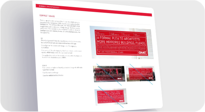 MODULE: TRANSPARENCY CORRECT USAGE From a graphic arts perspective, it can be challenging to reproduce the transparent GMC module over a photographic background. To achieve this goal, we have provided some suggestions and assistance to help you get the best quality every time. The module is also designed to work on all-white backgrounds and darker photos. On white backgrounds, the MODEL STYLING M PG CARGO ACADIA DENALI CHROME ACCENTS 17 CITY/24 HWY* 116.9 CU FT** box goes flat. A FORMAL PLEA TO ARCHITECTS: DO MORE MIRRORED BUILDINGS, PLEASE. Show background if there is visual interest behind the module, but only if it is simple and does not interfere with type Catching an extra glimpse of the premium Acadia Denali is something you’ll never get tired of. Impressively surrounded Use a light or “de-saturated” image—see Photography in chrome—from the front dual honeycomb grille to the exhaust tips, all the way down to the 20" chrome-clad wheels. Guidelines Combine all that with exclusive Denali accents throughout and you won’t just be attracting attention, you’ll be demanding it. Use parts of the photography that have simple, uncluttered WE ARE PROFESSIONAL GRADE. space, which helps make the type easy to read For applications where the module sits on a white background, the red field should be used at 100% DON’T Use a dark, complex or heavily saturated image—it will make type hard to read MODEL STYLING M PG CARGO MODEL STYLING M PG CARGO ACADIA DENALI CHROME ACCENTS 17 CITY/24 HWY* 116.9 CU FT** ACADIA DENALI CHROME ACCENTS 17 CITY/24 HWY* 116.9 CU FT** Use flat red over image A FORMAL PLEA TO ARCHITECTS: A FORMAL PLEA TO ARCHITECTS: Use the vehicle behind the box MORE MIRRORED BUILDINGS, PLEASE. MORE MIRRORED BUILDINGS, PLEASE. Catching an extra glimpse of the premium Acadia Denali is something you’ll never get tired of. Impressively surrounded Catching an extra glimpse of the premium Acadia Denali is something you’ll never get tired of. Impressively surrounded in chrome—from the front dual honeycomb grille to the exhaust tips, all the way down to the 20" chrome-clad wheels. in chrome—from the front dual honeycomb grille to the exhaust tips, all the way down to the 20" chrome-clad wheels. Combine all that with exclusive Denali accents throughout and you won’t just be attracting attention, you’ll be demanding Combine all that with exclusive Denali accents throughout and you won’t just be attracting attention, you’ll be demanding it. it. WE ARE PROFESSIONAL GRADE. WE ARE PROFESSIONAL GRADE. MODEL STYLING M PG CARGO ACADIA DENALI CHROME ACCENTS 17 CITY/24 HWY* 116.9 CU FT** A FORMAL PLEA TO ARCHITECTS: MORE MIRRORED BUILDINGS, PLEASE. Catching an extra glimpse of the premium Acadia Denali is something you’ll never get tired of. Impressively surrounded in chrome—from the front dual honeycomb grille to the exhaust tips, all the way down to the 20" chrome-clad wheels. Combine all that with exclusive Denali accents throughout and you won’t just be attracting attention, you’ll be demanding it. WE ARE PROFESSIONAL GRADE.