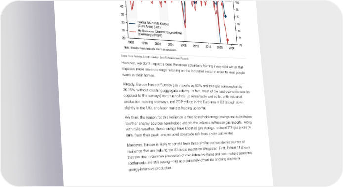 Goldman Sachs Global Economics Analyst Exhibit 13: Surveys of Gas-Intensive European Industries Have Plunged Source: Haver Analytics, Eurostat, Goldman Sachs Global Investment Research However, we dont expect a deep European downturn, barring a very cold winter that imposes more severe energy rationing on the industrial sector in order to keep people warm in their homes. Already, Europe has cut Russian gas imports by 80% and total gas consumption by 20-25% without crushing aggregate activity. In fact, most of the hard economic data (as opposed to the surveys) continue to hold up remarkably well so far, with industrial production moving sideways, real GDP still up in the Euro area in Q3 (though down slightly in the UK), and labor markets holding up so far. We think the reason for this resilience is that household energy savings and substitution to other energy sources have helped absorb the collapse in Russian gas imports. Along with mild weather, these savings have boosted gas storage, reduced TTF gas prices by 60% from their peak, and reduced downside risk from a very cold winter. Moreover, Europe is likely to benefit from three similar post-pandemic sources of resilience that are helping the US avoid recession altogether. First, Exhibit 14 shows that the rise in German production of chip-intensive items and cars—where pandemic bottlenecks are still easing—has approximately offset the ongoing decline in energy-intensive production. 16 November 2022 12