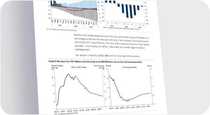 Goldman Sachs Global Economics Analyst Exhibit 4: The Boost From the Rebound in Real Income vs. the Drag From Financial Conditions Percent change vs. Dec. 2020 Percent change vs. Dec. 2020 Percentage points Percentage points 30 Household Disposable Income 30 2.0 Real US GDP Growth Impulse from GS FCI, 2.0 Transfers (Nominal) 3-Quarter Centered Moving Average 25 Other Income (Nominal) 25 1.5 1.5 20 Inflation 20 1.0 1.0 Real Disposable Income 15 15 0.5 0.5 10 10 0.0 0.0 5 5 -0.5 -0.5 0 0 -1.0 -1.0 -5 -5 -1.5 -1.5 -10 -10 -2.0 -2.0 -15 -15 -2.5 -2.5 Ja MarMay Ju SepNo JanMar May Ju Sep No Ja Mar MayJu SepNo 2341234123 n l v l v n l v 2021 2022 2023 2021 2022 2023 Note: The impulses assume that the FCI stays flat after November 15, 2022. Source: Goldman Sachs Global Investment Research But the most fundamental question is this: how can the Fed bring down inflation by 2 percentage points over the next year with only a ½pp increase in the unemployment rate (Exhibit 5)? Doesnt this fly in the face of the experience from prior high-inflation episodes—most notably the 1970s—that ended with a much bigger increase in unemployment? Our answer is that this cycle is different from prior high-inflation periods. Exhibit 5: We Expect Core PCE Inflation to Decline by 2pp by End-2023 With Only a ½pp Increase in the Unemployment Rate Percent change, USCore PCE Inflation Percent change, Percent US UnemploymentRate Percent year ago year ago 7 7 6 6 5 5 6 6 4 4 5 5 3 3 4 4 2 2 1 1 3 3 Jan-21 Jul-21 Jan-22 Jul-22 Jan-23 Jul-23 Jan-24 Jul-24 Jan-21 Jul-21 Jan-22 Jul-22 Jan-23 Jul-23 Jan-24 Jul-24 Note: Dashed lines indicate GS forecasts. Source: Haver Analytics, Goldman Sachs Global Investment Research The first reason why this cycle is different is that post-pandemic labor market overheating showed up not in excessive employment but in unprecedented job openings. As shown in Exhibit 6, job openings surged in 2020-2021 as employers sought to keep up with the strongest economic recovery on record amidst continuing Covid fears and exceptionally generous unemployment benefits. However, employment as a share of the labor force only rose to roughly the pre-pandemic level, not above. 16 November 2022 5