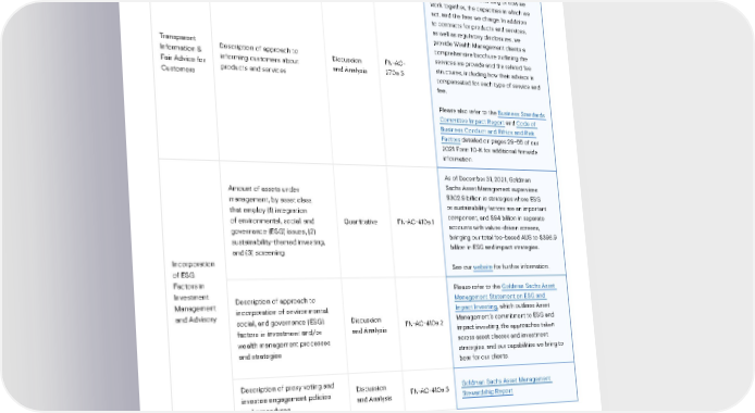 102 Sustainability Report 2021 Key Metrics & Indicators | SASB Index Sustainability Report 2021 Key Metrics & Indicators Topic Accounting Metric Category Code Response Asset management & custody activities Transparent Information & Fair Advice for Customers Description of approach to informing customers about products and services Discussion and Analysis FN-AC- 270a.3 We believe our clients are best served by having a clear understanding of how we work together, the capacities in which we act, and the fees we charge. In addition to contracts for products and services, as well as regulatory disclosures, we provide Wealth Management clients a comprehensive brochure outlining the services we provide and the related fee structures, including how their advisor is compensated for each type of service and fee. Please also refer to the Business Standards Committee Impact Report and Code of Business Conduct and Ethics and Risk Factors detailed on pages 29–55 of our 2021 Form 10-K for additional firmwide information. Incorporation of ESG Factors in Investment Management and Advisory Amount of assets under management, by asset class, that employ (1) integration of environmental, social, and governance (ESG) issues, (2) sustainability-themed investing, and (3) screening Quantitative FN-AC-410a.1 As of December 31, 2021, Goldman Sachs Asset Management supervises $302.9 billion in strategies where ESG or sustainability factors are an important component, and $94 billion in separate accounts with values-driven screens, bringing our total fee-based AUS to $396.9 billion in ESG and impact strategies. See our website for further information. Description of approach to incorporation of environmental, social, and governance (ESG) factors in investment and/or wealth management processes and strategies Discussion and Analysis FN-AC-410a.2 Please refer to the Goldman Sachs Asset Management Statement on ESG and Impact Investing , which outlines Asset Management’s commitment to ESG and impact investing, the approaches taken across asset classes and investment strategies, and our capabilities we bring to bear for our clients. Description of proxy voting and investee engagement policies and procedures Discussion and Analysis FN-AC-410a.3 Goldman Sachs Asset Management Stewardship Report KEY METRICS & INDICATORS