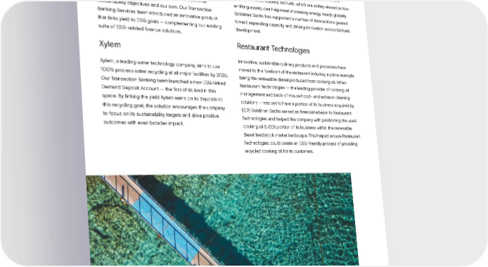 22 Sustainability Report 2021 Climate Transition | Driving Transition Driving ESG Product Innovation Through Transaction Banking We aim to build a smarter and greener treasury — and by partnering with our clients, we support both their sustainability objectives and our own. Our Transaction Banking Services team introduced an innovative product that links yield to ESG goals — complementing our existing suite of ESG-related finance solutions. Xylem Xylem, a leading water technology company, aims to use 100% process water recycling at all major facilities by 2025. Our Transaction Banking team launched a new ESG-linked Demand Deposit Account — the first of its kind in this space. By linking the yield Xylem earns on its deposits to this recycling goal, the solution encourages the company to focus on its sustainability targets and drive positive outcomes with even broader impact. Advancing Toward a Lower- carbon Future Replacing fossil fuels with lower-carbon alternatives has the potential to make a significant impact on both emissions and energy resource stability. Biofuels, which are widely viewed as low- emitting assets, can help meet increasing energy needs globally. Goldman Sachs has supported a number of transactions geared toward expanding capacity and driving innovation across biofuels development. Restaurant Technologies Innovative, sustainable culinary products and processes have moved to the forefront of the restaurant industry, a prime example being the renewable diesel produced from cooking oil. When Restaurant Technologies — the leading provider of cooking oil management and back-of-house hood- and exhaust-cleaning solutions — was set to have a portion of its business acquired by ECP, Goldman Sachs served as financial advisor to Restaurant Technologies and helped the company with positioning the used cooking oil (UCO) portion of its business within the renewable diesel feedstock market landscape. This helped ensure Restaurant Technologies could create an ESG-friendly process of providing recycled cooking oil for its customers. CLIMATE TRANSITION