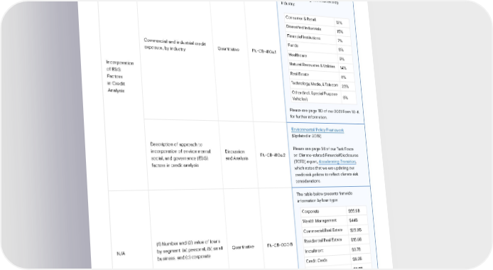 107 Sustainability Report 2021 Key Metrics & Indicators | SASB Index Sustainability Report 2021 Key Metrics & Indicators Topic Accounting Metric Category Code Response Commercial banks (Cont.) Incorporation of ESG Factors in Credit Analysis Commercial and industrial credit exposure, by industry Quantitative FN-CB-410a.1 Credit Exposure from Firmwide Corporate Loans and Lending Commitments by Industry: Please see page 110 of our 2021 Form 10-K for further information. Description of approach to incorporation of environmental, social, and governance (ESG) factors in credit analysis Discussion and Analysis FN-CB-410a.2 Environmental Policy Framework (Updated in 2019) Please see page 36 of our Task Force on Climate-related Financial Disclosures (TCFD) report, Accelerating Transition , which notes that we are updating our credit risk polices to reflect climate risk considerations. N/A (1) Number and (2) value of loans by segment: (a) personal, (b) small business, and (c) corporate Quantitative FN-CB-000.B The table below presents firmwide information by loan type: Please see page 155 of our 2021 Form 10-K for further information. Consumer & Retail 12% Diversified Industrials 15% Financial Institutions 7% Funds 8% Healthcare 9% Natural Resources & Utilities 14% Real Estate 6% Technology, Media, & Telecom 23% Other (incl. Special Purpose Vehicles) 6% Corporate $55.9B Wealth Management $44B Commercial Real Estate $25.9B Residential Real Estate $15.9B Installment $3.7B Credit Cards $8.2B Other $8.5B KEY METRICS & INDICATORS