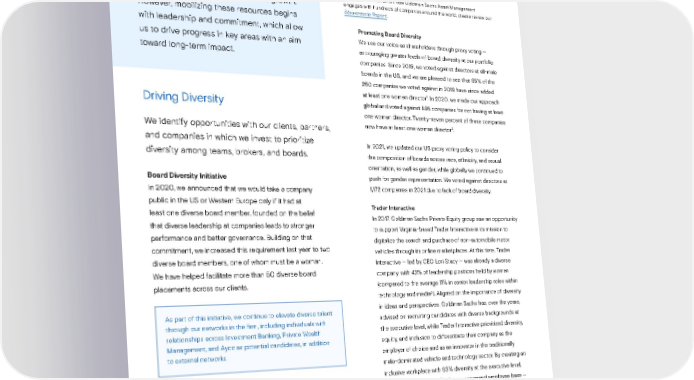 Commitment and Leadership Within our firm and across our broader ecosystem of partners, we have a range of tools designed to advance inclusive growth. However, mobilizing these resources begins with leadership and commitment, which allow us to drive progress in key areas with an aim toward long-term impact. Driving Diversity We identify opportunities with our clients, partners, and companies in which we invest to prioritize diversity among teams, brokers, and boards. Board Diversity Initiative In 2020, we announced that we would take a company public in the US or Western Europe only if it had at least one diverse board member, founded on the belief that diverse leadership at companies leads to stronger performance and better governance. Building on that commitment, we increased this requirement last year to two diverse board members, one of whom must be a woman. We have helped facilitate more than 50 diverse board placements across our clients. Goldman Sachs Asset Management Stewardship Our Global Stewardship Team seeks to promote best practices in ESG and corporate governance at portfolio companies through proxy voting, direct engagement, and industry collaboration. For more information on how Goldman Sachs Asset Management engages with hundreds of companies around the world, please review our Stewardship Report . Promoting Board Diversity We use our voice as shareholders through proxy voting — encouraging greater levels of board diversity at our portfolio companies. Since 2019, we voted against directors at all-male boards in the US, and we are pleased to see that 68% of the 250 companies we voted against in 2019 have since added at least one woman director¹. In 2020, we made our approach global and voted against 898 companies for not having at least one woman director. Twenty-seven percent of these companies now have at least one woman director². In 2021, we updated our US proxy voting policy to consider the composition of boards across race, ethnicity, and sexual orientation, as well as gender, while globally we continued to push for gender representation. We voted against directors at 1,172 companies in 2021 due to lack of board diversity. 5 As part of this initiative, we continue to elevate diverse talent through our networks in the firm, including individuals with relationships across Investment Banking, Private Wealth Management, and Ayco as potential candidates, in addition to external networks. Sustainability Report 2021 Inclusive Growth | Defining and Executing on Our Strategy 1, 2—Figures as of December 31, 2021. 3—McKinsey & Company: “ Closing the tech gender gap through philanthropy and corporate social responsibility .” September 2018. INCLUSIVE GROWTH Trader Interactive In 2017, Goldman Sachs Private Equity group saw an opportunity to support Virginia-based Trader Interactive in its mission to digitalize the search and purchase of non-automobile motor vehicles through its online marketplaces. At this time, Trader Interactive — led by CEO Lori Stacy — was already a diverse company, with 43% of leadership positions held by women (compared to the average 11% in senior leadership roles within technology and media 3 ). Aligned on the importance of diversity in ideas and perspectives, Goldman Sachs has, over the years, advised on recruiting candidates with diverse backgrounds at the executive level, while Trader Interactive prioritized diversity, equity, and inclusion to differentiate their company as the employer of choice and as an innovator in the traditionally male-dominated vehicle and technology sector. By creating an inclusive workplace with 83% diversity at the executive level, Trader Interactive benefits from an engaged employee base — resulting in more stimulating discussions, increased innovation, and less turnover. 70