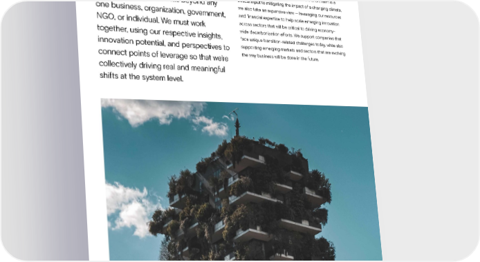 27 Sustainability Report 2021 Climate Transition | Accelerating Innovation The level of effort required to enact systemic change extends beyond any one business, organization, government, NGO, or individual. We must work together, using our respective insights, innovation potential, and perspectives to connect points of leverage so that we’re collectively driving real and meaningful shifts at the system level. Accelerating Innovation CLIMATE TRANSITION While we know that driving change in the short term is a critical input to mitigating the impact of a changing climate, we also take an expansive view — leveraging our resources and financial expertise to help scale emerging innovation across sectors that will be critical to driving economy- wide decarbonization efforts. We support companies that face unique transition-related challenges today, while also supporting emerging markets and sectors that are evolving the way business will be done in the future.