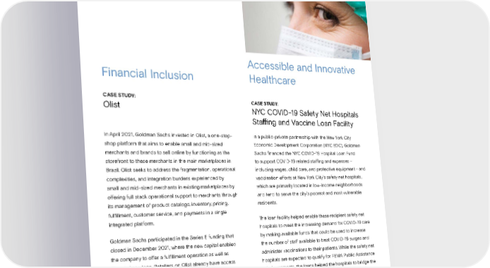133 Sustainability Report 2021 Sustainability Issuance Report | Featured Investments In April 2021, Goldman Sachs invested in Olist, a one-stop- shop platform that aims to enable small and mid-sized merchants and brands to sell online by functioning as the storefront to these merchants in the main marketplaces in Brazil. Olist seeks to address the fragmentation, operational complexities, and integration burdens experienced by small and mid-sized merchants in existing marketplaces by offering full stack operational support to merchants through its management of product catalogs, inventory, pricing, fulfillment, customer service, and payments in a single integrated platform. Goldman Sachs participated in the Series E funding that closed in December 2021, where the new capital enabled the company to offer a fulfillment operation as well as financial services. Retailers on Olist already have access to credit lines for working capital, and the company plans to expand that technology to include risk management, accelerated sales, and internal credit models for merchants. The company recently began operations in Mexico and intends to expand its footprint across Latin America. In a public-private partnership with the New York City Economic Development Corporation (NYC EDC), Goldman Sachs financed the NYC COVID-19 Hospital Loan Fund to support COVID-19 related staffing and expenses – including wages, child care, and protective equipment – and vaccination efforts at New York City’s safety net hospitals, which are primarily located in low-income neighborhoods and tend to serve the city’s poorest and most vulnerable residents. The loan facility helped enable these recipient safety net hospitals to meet the increasing demand for COVID-19 care by making available funds that could be used to increase the number of staff available to treat COVID-19 surges and administer vaccinations to their patients. While the safety net hospitals are expected to qualify for FEMA Public Assistance reimbursements, the loans helped the hospitals to bridge the timing gap between immediate financing needs and future reimbursements. NYC Emergency Management (NYCEM) and Community Preservation Corporation, a local non-profit Community Development Financial Institution, were both part of the partnership. Financial Inclusion CASE STUDY: Olist Accessible and Innovative Healthcare CASE STUDY: NYC COVID-19 Safety Net Hospitals Staffing and Vaccine Loan Facility