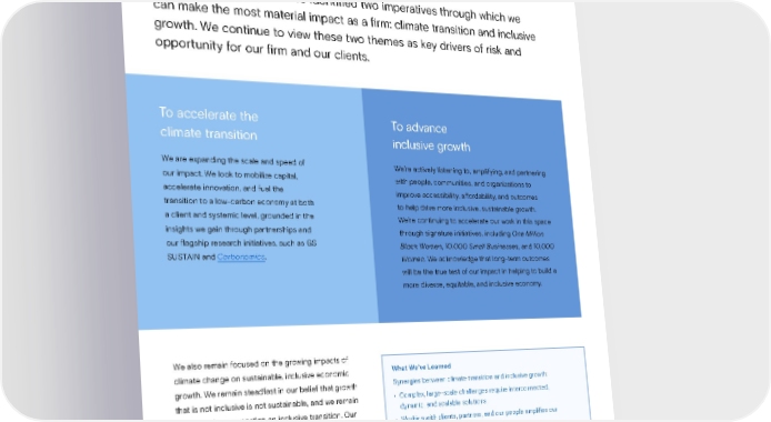 Sustainability Report 2021 Introduction 8 Our Strategic Framework At Goldman Sachs, we have identified two imperatives through which we can make the most material impact as a firm: climate transition and inclusive growth. We continue to view these two themes as key drivers of risk and opportunity for our firm and our clients. To advance inclusive growth We’re actively listening to, amplifying, and partnering with people, communities, and organizations to improve accessibility, affordability, and outcomes to help drive more inclusive, sustainable growth. We’re continuing to accelerate our work in this space through signature initiatives, including One Million Black Women, 10,000 Small Businesses, and 10,000 Women . We acknowledge that long-term outcomes will be the true test of our impact in helping to build a more diverse, equitable, and inclusive economy. We also remain focused on the growing impacts of climate change on sustainable, inclusive economic growth. We remain steadfast in our belief that growth that is not inclusive is not sustainable, and we remain committed to supporting an inclusive transition. Our work here is just beginning, and we will continue to report on our areas of focus and impact in this space. To accelerate the climate transition We are expanding the scale and speed of our impact. We look to mobilize capital, accelerate innovation, and fuel the transition to a low-carbon economy at both a client and systemic level, grounded in the insights we gain through partnerships and our flagship research initiatives, such as GS SUSTAIN and Carbonomics . What We’ve Learned Synergies between climate transition and inclusive growth: • Complex, large-scale challenges require interconnected, dynamic, and scalable solutions. • Working with clients, partners, and our people amplifies our impact. INTRODUCTION