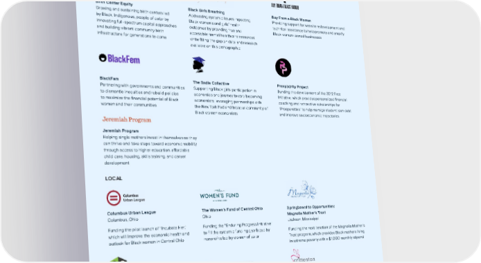 61 Sustainability Report 2021 Inclusive Growth | One Million Black Women Sustainability Report 2021 Inclusive Growth | One Million Black Women 61 Supporting Nonprofits Focused on Black Women Goldman Sachs Foundation initiated community grants to Black women-led nonprofits across One Million Black Women areas with both national and local impact. NATIONAL LOCAL The Fund for the School District of Philadelphia Philadelphia, Pennsylvania Increasing the hiring and retention of BIPOC teachers working in Philadelphia schools Columbus Urban League Columbus, Ohio Funding the pilot launch of “Incubate Her,” which will improve the economic health and outlook for Black women in Central Ohio The Women’s Fund of Central Ohio Ohio Funding the “Enduring Progress Initiative” to fill the systemic funding gap faced by nonprofits led by women of color Prosp(a)rity Project Funding the development of the 35*2 Free Initiative, which provides personalized financial coaching and retroactive scholarships for “Prosperettes” to help manage student loan debt and improve socioeconomic trajectories Springboard to Opportunities: Magnolia Mother’s Trust Jackson, Mississippi Funding the next iteration of the Magnolia Mother’s Trust program, which provides Black mothers living in extreme poverty with a $1,000 monthly stipend Corner to Corner Nashville, Tennessee Helping underestimated entrepreneurs in Nashville plan, start, and grow their own small businesses Crittenton Services of Greater Washington Washington, D.C. Supporting the social and emotional skills development of middle- and high-school girls from low-income families to help them complete college and become economically secure INCLUSIVE GROWTH Birth Center Equity Growing and sustaining birth centers led by Black, Indigenous, people of color by innovating full-spectrum capital approaches and building vibrant community birth infrastructure for generations to come Black Girls Breathing Addressing systemic issues impacting Black women’s and girls’ health outcomes by providing free and accessible mental healthcare resources while filling the gap on data and research available on this demographic BlackFem Partnering with governments and communities to dismantle inequities and rebuild policies to maximize the financial potential of Black women and their communities Jeremiah Program Helping single mothers invest in themselves so they can thrive and take steps toward economic mobility through access to higher education, affordable child care, housing, skills training, and career development The Sadie Collective Supporting Black girls’ participation in economics and journey toward becoming economists, leveraging partnerships with the New York Fed and broader community of Black women economists Buy From a Black Woman Providing support for website redevelopment and technical assistance to help promote and amplify Black women-owned businesses