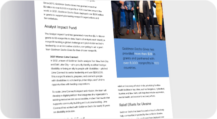 80 Goldman Sachs Gives Goldman Sachs Gives fosters innovative ideas, works to solve economic and social issues, and enables progress in underserved communities globally. Goldman Sachs’ current and retired senior employees work together to recommend grants to qualifying nonprofit organizations to help them achieve their goals. Since 2010, Goldman Sachs Gives has granted more than $2 billion to over 8,000 nonprofits in 100 countries around the world. In 2021, Goldman Sachs Gives deployed over $230 million in grants to support pioneering nonprofit organizations and firm initiatives. Analyst Impact Fund The Analyst Impact Fund has generated more than $2.7 million in grants to 93 nonprofits to date. Teams of analysts each identify a nonprofit tackling a global challenge and pitch Goldman Sachs leadership on an innovative solution, competing to win a grant from Goldman Sachs Gives for their chosen nonprofit. 2021 Winner: Lime Connect In 2021, a team of Goldman Sachs analysts from New York City and Salt Lake City — who proudly identify as either having a disability or being an ally to people with disabilities — pitched Lime Connect to senior leadership and won $250,000. This nonprofit attracts, prepares, and connects people with disabilities to scholarships, internships, and full-time opportunities with leading corporations. To scale Lime Connect’s impact and mission, the team will develop a digital platform that integrates the organization’s existing resources into an accessible, modern framework that supports community building and outcome tracking. Lime Connect has worked with Goldman Sachs for nearly 15 years on disability inclusion. COVID-19 Relief Fund The Goldman Sachs COVID-19 Relief Fund was created to help the world’s hardest-hit communities during the pandemic. This fund has deployed $54 million to more than 300 nonprofits across 31 countries. Last year, this included $10 million to support COVID-19 relief and recovery efforts in India, prioritizing frontline health facilities in key cities, such as Bengaluru, Hyderabad, Mumbai, and New Delhi, with help that include vaccination, mental health, and economic recovery efforts. Relief Efforts for Ukraine Goldman Sachs has been focused on how to effectively help communities impacted by the conflict in Ukraine. Goldman Sachs and its employees have deployed over $3 million in donations to support nonprofit organizations providing Ukrainian families with emergency assistance, such as food, medical care, and essential goods, as people have fled their homes. Sustainability Report 2021 Inclusive Growth | Driving Change Across Our Firm Goldman Sachs Gives has provided more than $2B in grants and partnered with over 8,000 nonprofits in 100 countries. INCLUSIVE GROWTH