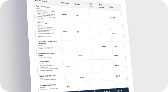 120 Benchmark Issuance On February 12, 2021, Goldman Sachs issued our inaugural sustainability bond; $800 Million 5NC4yr fixed-to-floating rate benchmark notes. Funding has been allocated to $819.4 Million of eligible investments and loans. Our inaugural bond also had a syndicate of exclusively minority-led broker dealers, demonstrating our continued commitment to elevating diversity and inclusion in considering partners and choosing the counterparties we work with. Funding Allocation Impact theme Americas Europe Asia Pacific Multi- Region Total Financial inclusion $289.4 $26.1 $315.5 Clean energy $209.2 $7.1 $216.3 Accessible and Affordable Education $98.9 $98.9 Sustainable transport $65.6 $65.6 Communities $62.8 $62.8 Waste and materials $58.6 $58.6 Ecosystem services $1.7 $1.7 Grand total $563.1 $157. 4 $0.0 $98.9 $819.4 Related to: · Mobile point of sale provider for small and medium-sized enterprises · E-commerce platform provider connecting merchants to marketplaces in Brazil · Loans through Goldman Sachs' consumer business, Marcus Related to: · Educational software provider serving people with learning disabilities Related to: · Lithium-ion battery supplier Related to: · Prefabricated homes manufacturer Related to: · Sustainable stormwater infrastructure Related to: · Historic Negro League Ballpark and community facility · 100% affordable, multi-family residential and mixed use developments¹ Related to: · Meter asset provider for residential electricity and gas meters for cleaner, efficient, sustainable energy · Consulting and engineering services company serving land and power end markets · Wind farm development in Texas Sustainability Report 2021 Sustainability Issuance Report | Sustainability Issuances ¹Affordable housing is defined in this context as housing that is affordable to tenants earning up to 80% of the area median income. For additional details on eligibility criteria associated with relevant green and social project categories, please refer to our Sustainability Issuance Framework (p. 2-6)