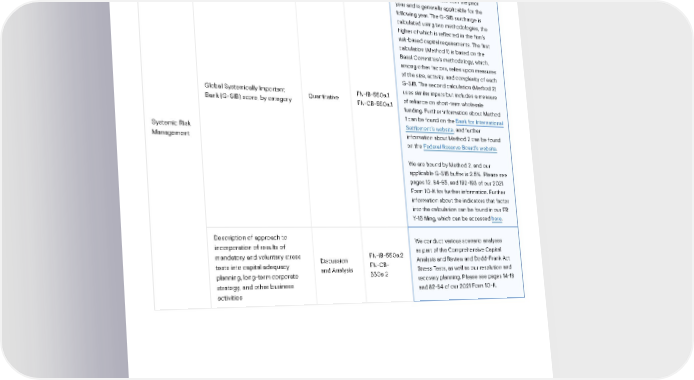 101 Sustainability Report 2021 Key Metrics & Indicators | SASB Index Sustainability Report 2021 Key Metrics & Indicators Topic Accounting Metric Category Code Response Disclosures included in multiple sectors’ standards (Cont.) Systemic Risk Management Global Systemically Important Bank (G-SIB) score, by category Quantitative FN-IB-550a.1 FN-CB-550a.1 The G-SIB surcharge is updated annually based on financial data from the prior year and is generally applicable for the following year. The G-SIB surcharge is calculated using two methodologies, the higher of which is reflected in the firm’s risk-based capital requirements. The first calculation (Method 1) is based on the Basel Committee’s methodology, which, among other factors, relies upon measures of the size, activity, and complexity of each G-SIB. The second calculation (Method 2) uses similar inputs but includes a measure of reliance on short-term wholesale funding. Further information about Method 1 can be found on the Bank for International Settlement’s website , and further information about Method 2 can be found on the Federal Reserve Board’s website . We are bound by Method 2, and our applicable G-SIB buffer is 2.5%. Please see pages 12, 84-85, and 192-193 of our 2021 Form 10-K for further information. Further information about the indicators that factor into the calculation can be found in our FR Y-15 filing, which can be accessed here . Description of approach to incorporation of results of mandatory and voluntary stress tests into capital adequacy planning, long-term corporate strategy, and other business activities Discussion and Analysis FN-IB-550a.2 FN-CB- 550a.2 We conduct various scenario analyses as part of the Comprehensive Capital Analysis and Review and Dodd-Frank Act Stress Tests, as well as our resolution and recovery planning. Please see pages 14-18 and 82-84 of our 2021 Form 10-K. KEY METRICS & INDICATORS