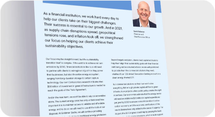 INTRODUCTION 4 Sustainability Report 2021 Introduction Fellow Shareholders: David Solomon Chairman and Chief Executive Officer Our focus may be straightforward, but the sustainability transition itself is complex. If the world is to achieve net zero emissions by 2050, financial institutions like ours will need to partner with clients to reimagine not just how they power their businesses, but also the entire energy ecosystem, ranging from long-duration storage to carbon capture technology. Our own Carbonomics research indicates that $56 trillion of investment in green infrastructure is needed to reach the goals of the Paris Agreement. And in the near term, we won’t be able to rely on renewables alone. The current energy crisis has only underscored how important it is to maintain access to reliable and affordable energy, and to do so we will need to use all the tools at our disposal. At Goldman Sachs, we will continue providing support, capital, and advice to traditional energy producers both in the near team, as they supply energy, and in the long term, as they decarbonize their businesses. Beyond targets and plans, clients need capital and tools to help them align their sustainability goals with their financial well-being, and as a trusted advisor, we are well-positioned to provide them the commercial solutions they need, whether it’s an ESG-linked Transaction Banking account or a clean energy-themed ETF. But commercial solutions on their own won’t solve everything. Not enough private capital will flow to green infrastructure projects unless public policy creates the right incentives. Our economists estimate that the energy sector will need an additional $1.5 trillion in capital expenditures per year by 2032 to ensure a smooth transition to a low- carbon economy, and the economic ramifications of the war in Ukraine have only added to the sense of urgency. For its part, the US Congress could help by passing the Build Back Better Act’s energy provisions, which include support for greater investment in renewables and electric vehicles, methane restrictions, and carbon capture tax credits. As a financial institution, we work hard every day to help our clients take on their biggest challenges. Their success is essential to our growth. And in 2021, as supply chain disruptions spread, geopolitical tensions rose, and inflation took off, we strengthened our focus on helping our clients achieve their sustainability objectives. Letter to Our Shareholders