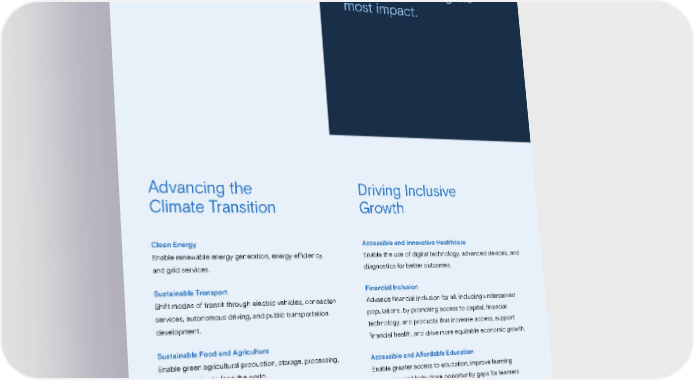 112 Clean Energy Enable renewable energy generation, energy efficiency, and grid services. Sustainable Transport Shift modes of transit through electric vehicles, connected services, autonomous driving, and public transportation development. Sustainable Food and Agriculture Enable green agricultural production, storage, processing, and distribution to feed the world. Waste and Materials Promote sustainable production and consumption, along with responsible waste management. Ecosystem Services Contribute to the sustainable management of natural resources and monetize the value of forests, water, and biodiversity. Accessible and Innovative Healthcare Enable the use of digital technology, advanced devices, and diagnostics for better outcomes. Financial Inclusion Advance financial inclusion for all, including underserved populations, by promoting access to capital, financial technology, and products that increase access, support financial health, and drive more equitable economic growth. Accessible and Affordable Education Enable greater access to education, improve learning outcomes, and help close opportunity gaps for learners of all ages. Communities Enable infrastructure development, affordable housing, and livelihood advancement. OVERVIEW OF SUSTAINABILITY THEMES Advancing the Climate Transition Driving Inclusive Growth We’ve structured our commitment around nine key priority areas that we’ve identified as having the most impact.