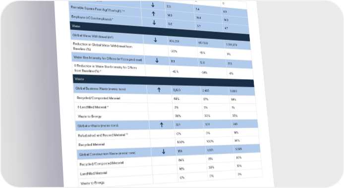 96 Sustainability Report 2021 Key Metrics & Indicators | Environmental Indicators Sustainability Report 2021 Key Metrics & Indicators KEY METRICS & INDICATORS Note 1: Many metrics trending upward from 2020 to 2021 are primarily due to lifting COVID-19 restrictions and employees returning to the office. Note 3: This symbol ◊ before an indicator denotes an environmental commitment through Goldman’s 2025 ESG and Net Zero Commitments and ongoing 2020 Operational Commitments. Net Emissions noted as zero represents achievement of the firm’s carbon neutral commitment across operations and business travel. Reductions are from a 2017 baseline, except plastics which are from a 2021 baseline or where otherwise noted. Note 7: Metrics are normalized using Scope 1 & Scope 2 (location) emissions. Note 8: Metric includes only emissions from Scope 1 & Scope 2 (location) from rentable square footage; jet fuel is excluded. Note 9: The firm has diverted 100% business waste from landfill where alternative disposal methods exist. Currently no alternatives exist in Hong Kong, China, Australia, New Zealand, and parts of India. Note 10: The firm began tracking refurbished material as separate from recycled material in 2019. Historical data points may be adjusted to reflect new information and/or changes to protocols. Trend 2020-2021 1 2021 2020 2019 Greenhouse Gas (GHG) Emissions (Cont.) Verified Carbon Avoidance Offsets (tCO 2e) 3 26,116 43,225 157, 255 Verified Carbon Removals (tCO 2e) 3 20,000 0 0 Revenues (tCO 2e/$M) 7 2.6 3.4 4.9 Rentable Square Feet (kgCO 2e/sqft) 7 , 8 14.9 14.4 14.9 Employee (tCO 2e/employee) 7 3.6 3.7 4.7 Water Global Water Withdrawal (m 3) 802,231 810,529 1,093,979 Reduction in Global Water Withdrawal from Baseline (%) -20% -19% 9% Water Use Intensity for Offices (m 3/occupied seat) 11.1 12.6 17. 5 ◊ Reduction in Water Use Intensity for Offices from Baseline (%) 3 -42% -34% -8% Waste Global Business Waste (metric tons) 2,820 2,485 5,990 Recycled/Composted Material 58% 67% 64% ◊ Landfilled Material 9 3% 3% 1% Waste to Energy 39% 30% 35% Global e-Waste (metric tons) 321 301 243 Refurbished and Reused Material 10 0% 0% 14% Recycled Material 100% 100% 86% Global Construction Waste (metric tons) 158 1,621 3,395 Recycled/Composted Material 84% 61% 90% Landfilled Material 16% 39% 10% Waste to Energy 0% 0% 0%