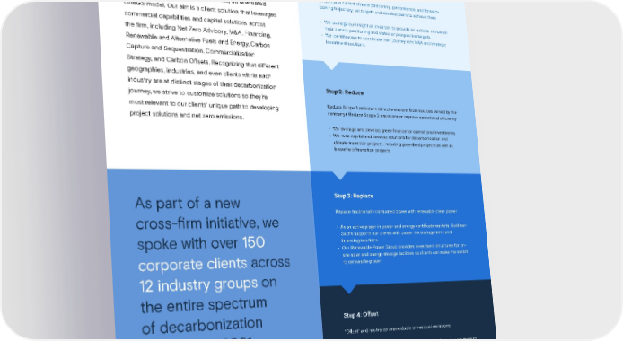 23 Sustainability Report 2021 Climate Transition | Driving Transition Decarbonization Offering We’ve leaned into helping clients accelerate their climate-related strategies and objectives. In doing so, Goldman Sachs is developing a new and unique cross-firm Decarbonization offering to cover a full suite of tools, delivered through our holistic, differentiated OneGS model. Our aim is a client solution that leverages commercial capabilities and capital solutions across the firm, including Net Zero Advisory, M&A, Financing, Renewable and Alternative Fuels and Energy, Carbon Capture and Sequestration, Commercialization Strategy, and Carbon Offsets. Recognizing that different geographies, industries, and even clients within each industry are at distinct stages of their decarbonization journey, we strive to customize solutions so they’re most relevant to our clients’ unique path to developing project solutions and net zero emissions. As part of a new cross-firm initiative, we spoke with over 150 corporate clients across 12 industry groups on the entire spectrum of decarbonization solutions in 2021. THE DECARBONIZATION JOURNEY Step 1: Measure and Plan Understand current climate positioning, performance, and forward- looking trajectory; set targets and develop plans to achieve them • We leverage our insight as investors to provide an outside-in view on their climate positioning and stated or prospective targets. • We identify ways to accelerate their journey with M&A and strategic investment solutions. Step 3: Replace Replace traditionally consumed power with renewable clean power • As an active player in power and energy certificate markets, Goldman Sachs supports our clients with power risk management and financing solutions. • Our Renewable Power Group provides investment structures for on- site solar and energy storage facilities so clients can make the switch to renewable power. Step 4: Offset “Offset” and neutralize unavoidable or residual emissions • We support our clients with supply, offtake, and financing solutions in the Voluntary Carbon Markets. • We also develop financial solutions for companies investing in or providing offsets, including nature-based carbon offset project platforms focused on localized social benefits and developing blue- green local economies. Step 2: Reduce Reduce Scope 1 emissions (direct emissions from sources owned by the company); Reduce Scope 2 emissions or improve operational efficiency • We leverage and develop green finance for operational investments. • We raise capital and develop solutions for decarbonization and climate transition projects, including greenfield projects as well as brownfield/transition projects. CLIMATE TRANSITION