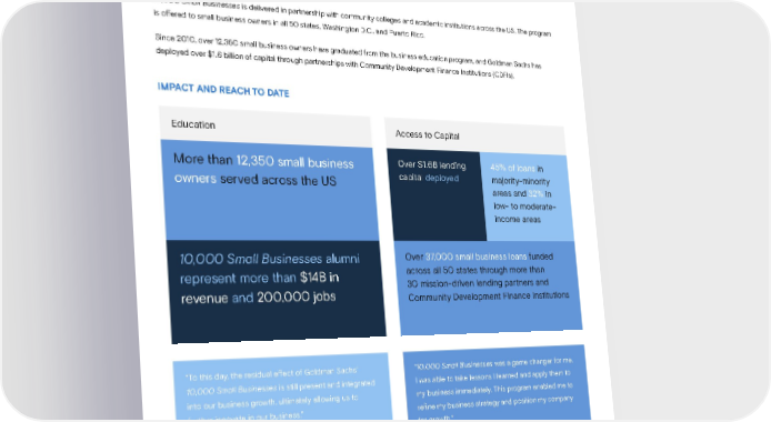 75 Sustainability Report 2021 Inclusive Growth | Leveraging Partnerships “ 10,000 Small Businesses was a game changer for me. I was able to take lessons I learned and apply them to my business immediately. This program enabled me to refine my business strategy and position my company for growth.” Unlocking Growth Through 10,000 Small Businesses 10,000 Small Businesses in the US 10,000 Small Businesses is delivered in partnership with community colleges and academic institutions across the US. The program is offered to small business owners in all 50 states, Washington D.C., and Puerto Rico. Since 2010, over 12,350 small business owners have graduated from the business education program, and Goldman Sachs has deployed over $1.6 billion of capital through partnerships with Community Development Finance Institutions (CDFIs). 10,000 Small Businesses helps entrepreneurs grow and create jobs by providing business education, access to capital, and business support services. IMPACT AND REACH TO DATE MARC COLEMAN The Tactile Group, Philadelphia, PA 10,000 Small Businesses Graduate More than 12,350 small business owners served across the US 10,000 Small Businesses alumni represent more than $14B in revenue and 200,000 jobs “To this day, the residual effect of Goldman Sachs’ 10,000 Small Businesses is still present and integrated into our business growth, ultimately allowing us to further innovate in our business.” Over $1.6B lending capital deployed 45% of loans in majority-minority areas and 32% in low- to moderate- income areas Over 37,000 small business loans funded across all 50 states through more than 30 mission-driven lending partners and Community Development Finance Institutions Education Access to Capital BRANDI HARLEAUX South Post Oak Recycling Center, Houston, TX 10,000 Small Businesses Graduate INCLUSIVE GROWTH