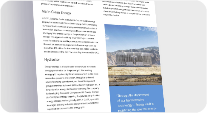 Sustainability Report 2021 Climate Transition | Accelerating Innovation “Through the deployment of our transformative technology ... Energy Vault is redefining the role that energy storage companies can and should play within a circular economic framework.” ROBERT PICONI CEO and Co-founder, Energy Vault Next Phase of Renewables Accelerating the transition to a low-carbon economy will require innovative solutions that catalyze not only renewable energy generation but also improvements in energy efficiency and storage, as well as grid services to shift to a clean energy future. We work with our clients to develop market-based, commercially viable solutions as we look to unlock the next phase of rapid renewable expansion. Marin Clean Energy In 2021, Goldman Sachs executed its first renewable energy prepay transaction with Marin Clean Energy (MCE), leveraging our expertise in municipal prepays and renewables to adapt a transaction structure commonly used to procure natural gas and apply it to enable savings in the procurement of clean energy. This approach will help lower MCE’s procurement costs for existing renewable power purchase agreements over the next six years and is expected to lower energy costs by more than $14 million for the more than one million residents and businesses in the San Francisco Bay Area served by MCE. Hydrostor Energy storage is a key enabler to continued renewable energy penetration on the power grid. The existing energy grid requires significant advancement to add more renewable power to the system. Through a preferred equity financing commitment, our Asset Management group committed to invest $250 million in Hydrostor Inc., a long-duration energy technology company. The company is developing Advanced Compressed Air Energy Storage (A-CAES) technology targeting the growing long-duration energy storage market globally. With A-CAES, Hydrostor leverages existing industrial equipment with established supply chains to evolve the energy grid. CLIMATE TRANSITION Energy Vault Goldman Sachs acted as financial advisor to Energy Vault in its $1.1 billion merger with Novus Capital Corporation II to become a public company. Energy Vault is a creator of gravity- based, grid-scale energy storage solutions that recycle waste products like coal ash and glass fibers from retired wind turbine blades into energy storage. These solutions are key to building needed energy storage infrastructure at locations where lithium battery storage or pumped-storage hydropower may not be feasible. 30