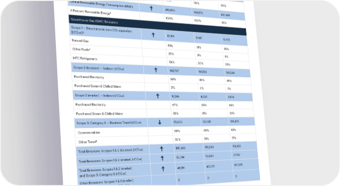 95 Sustainability Report 2021 Key Metrics & Indicators | Environmental Indicators Sustainability Report 2021 Key Metrics & Indicators KEY METRICS & INDICATORS Note 1: Many metrics trending upward from 2020 to 2021 are primarily due to lifting COVID-19 restrictions and employees returning to the office. Note 3: This symbol ◊ before an indicator denotes an environmental commitment through Goldman’s 2025 ESG and Net Zero Commitments and ongoing 2020 Operational Commitments. Net Emissions noted as zero represents achievement of the firm’s carbon neutral commitment across operations and business travel. Reductions are from a 2017 baseline, except plastics which are from a 2021 baseline or where otherwise noted. Note 4: Other fuels includes jet fuel and fuel oil. Note 5: The firm sourced renewable electricity equivalent to 100% of global electricity consumption. 96% is in line with RE100 market boundary criteria. Note 6: This includes charter air, rail, bus, ferry, car, and hotels. Historical data points may be adjusted to reflect new information and/or changes to protocols. Trend 2020-2021 1 2021 2020 2019 Energy (Cont.) Energy Use Intensity for Offices (kWh/sq. ft.) 21.3 20.7 26.5 ◊ Reduction in Energy Use Intensity for Offices from Baseline (%) 3 -36% -38% -20% Global Renewable Energy Consumption (MWh) 416,660 399,572 460,455 ◊ Percent Renewable Energy 5 100% 100% 98% Greenhouse Gas (GHG) Emissions Scope 1 — Direct (metric tons CO 2 equivalent [tCO 2e]) 4 12,166 9,647 12,673 Natural Gas 51% 61% 68% Other Fuels 4 25% 9% 6% HFC Refrigerants 24% 30% 26% Scope 2 (location) — Indirect (tCO 2e) 143,797 141,583 166,249 Purchased Electricity 98% 98% 98% Purchased Steam & Chilled Water 2% 2% 2% Scope 2 (market) — Indirect (tCO 2e) 10,148 4,283 9,109 Purchased Electricity 67% 39% 64% Purchased Steam & Chilled Water 33% 61% 36% Scope 3: Category 6 — Business Travel (tCO 2e) 23,802 29,295 135,473 Commercial Air 68% 69% 83% Other Travel 6 32% 31% 17% Total Emissions: Scopes 1 & 2 (location) (tCO 2e) 155,963 151,230 178,922 Total Emissions: Scopes 1 & 2 (market) (tCO 2e) 22,314 13,930 21,782 Total Emissions: Scopes 1 & 2 (market), and Scope 3: Category 6 (tCO 2e) 46,116 43,225 157, 255 ◊ Net Emissions: Scopes 1 & 2 (market), and Scope 3: Category 6 (tCO 2e) 3 0 0 0