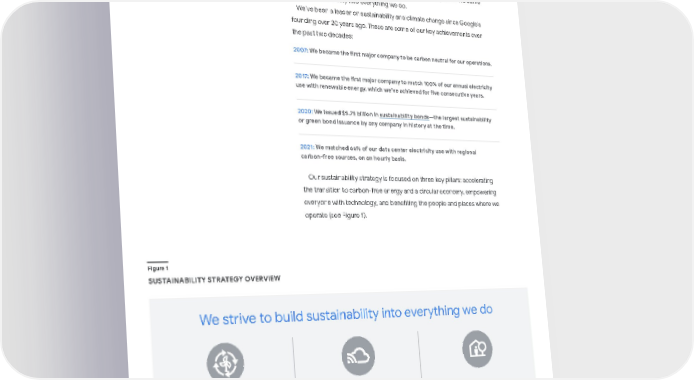 Our approach We believe that every business has the opportunity and obligation to protect our planet. Sustainability is one of our core values at Google, and we strive to build sustainability into everything we do. We’ve been a leader on sustainability and climate change since Google’s founding over 20 years ago. These are some of our key achievements over the past two decades: 2007: We became the first major company to be carbon neutral for our operations. 2017: We became the first major company to match 100% of our annual electricity use with renewable energy, which we’ve achieved for five consecutive years. 2020: We issued $5.75 billion in sustainability bonds —the largest sustainability or green bond issuance by any company in history at the time. 2021: We matched 66% of our data center electricity use with regional carbon-free sources, on an hourly basis. Our sustainability strategy is focused on three key pillars: accelerating the transition to carbon-free energy and a circular economy, empowering everyone with technology, and benefiting the people and places where we operate (see Figure 1). Figure 1 SUSTAINABILITY STRATEGY OVERVIEW We strive to build sustainability into everything we do Empower with technology Tackle major sustainability problems and drive net-positive impact using Google technologies, platforms, products, and services Accelerate carbon-free and circular Decouple business growth from the growth of carbon intensity and material use Benefit people and places Share benefits with the communities of our facilities, users, partners, and suppliers 2 Google Environmental Report 2022