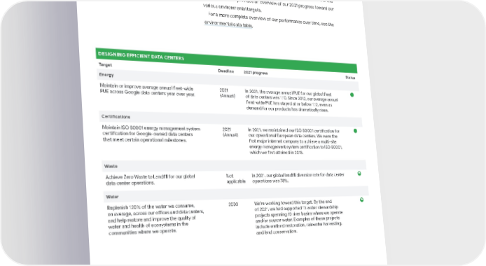 DESIGNING EFFICIENT DATA CENTERS Target Deadline 2021 progress Status Energy Maintain or improve average annual fleet-wide PUE across Google data centers year over year. 2021 (Annual) In 2021, the average annual PUE for our global fleet of data centers was 1.10. Since 2012, our average annual fleet-wide PUE has stayed at or below 1.12, even as demand for our products has dramatically risen. Certifications Maintain ISO 50001 energy management system certification for Google-owned data centers that meet certain operational milestones. 2021 (Annual) In 2021, we maintained our ISO 50001 certification for our operational European data centers. We were the first major internet company to achieve a multi-site energy management system certification to ISO 50001, which we first attained in 2013. Waste Achieve Zero Waste to Landfill for our global data center operations. Not applicable In 2021, our global landfill diversion rate for data center operations was 78%. Water Replenish 120% of the water we consume, on average, across our offices and data centers, and help restore and improve the quality of water and health of ecosystems in the communities where we operate. 2030 We’re working toward this target. By the end of 2021, we had supported 13 water stewardship projects spanning 10 river basins where we operate and/or source water. Examples of these projects include wetland restoration, rainwater harvesting, and land conservation. Progress against targets As a data-driven company, we believe it is critical to regularly track progress toward our commitments and share updates with our stakeholders. The following section provides an overview of our 2021 progress toward our various environmental targets. For a more complete overview of our performance over time, see the environmental data table . Achieved Missed In progress 8 Google Environmental Report 2022