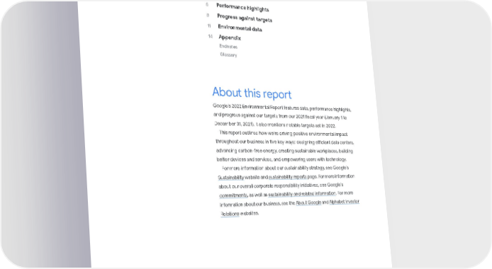 Table of contents 1 About this report 2 Our approach 5 Performance highlights 8 Progress against targets 11 Environmental data 14 Appendix Endnotes Glossary About this report Google’s 2022 Environmental Report features data, performance highlights, and progress against our targets from our 2021 fiscal year (January 1 to December 31, 2021). It also mentions notable targets set in 2022. This report outlines how we’re driving positive environmental impact throughout our business in five key ways: designing efficient data centers, advancing carbon-free energy, creating sustainable workplaces, building better devices and services, and empowering users with technology. For more information about our sustainability strategy, see Google’s Sustainability website and sustainability reports page. For more information about our overall corporate responsibility initiatives, see Google’s c ommitments , as well as sustainability and related information . For more information about our business, see the About Google and Alphabet Investor Relations websites. 1 Google Environmental Report 2022