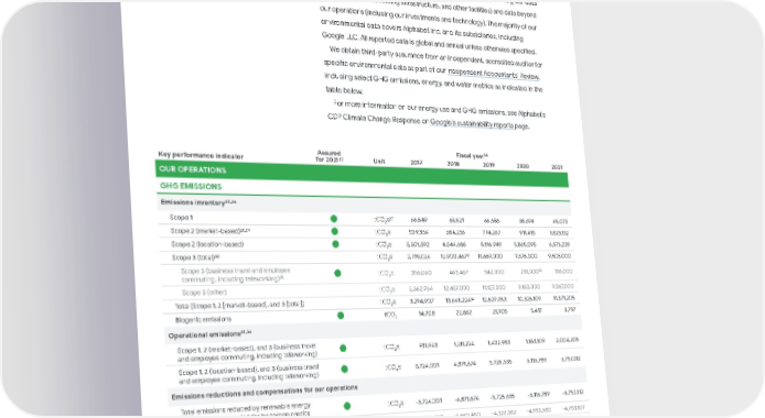 Key performance indicator Assured for 2021 23 Unit Fiscal year 24 2017 2018 2019 2020 2021 OUR OPERATIONS GHG EMISSIONS Emissions inventory 25 , 26 Scope 1 tCO 2 e 27 66,549 63,521 66,686 38,694 45,073 Scope 2 (market-based) 28 , 29 tCO 2 e 509,334 684,236 794,267 911,415 1,823,132 Scope 2 (location-based) tCO 2 e 3,301,392 4,344,686 5,116,949 5,865,095 6,576,239 Scope 3 (total) 30 tCO 2 e 2,719,024 12,900,467 31 11,669,000 9,376,000 9,503,000 Scope 3 (business travel and employee commuting, including teleworking) 32 tCO 2 e 356,060 463,467 542,000 213,000 33 136,000 Scope 3 (other) tCO 2 e 2,362,964 12,437,000 11,127,000 9,163,000 9,367,000 Total (Scope 1, 2 [market-based], and 3 [total]) tCO 2 e 3,294,907 13,648,224 34 12,529,953 10,326,109 11,371,205 Biogenic emissions tCO 2 14,708 22,862 21,905 5,417 3,797 Operational emissions 35 , 36 Scope 1, 2 (market-based), and 3 (business travel and employee commuting, including teleworking) tCO 2 e 931,943 1,211,224 1,402,953 1,163,109 2,004,205 Scope 1, 2 (location-based), and 3 (business travel and employee commuting, including teleworking) tCO 2 e 3,724,001 4,871,674 5,725,635 6,116,789 6,757,312 Emissions reductions and compensations for our operations Total emissions reduced by renewable energy PPAs and compensated for by carbon credits tCO 2 e -3,724,001 -4,871,674 -5,725,635 -6,116,789 -6,757,312 Emissions reduced by renewable energy PPAs 37 tCO 2 e -2,792,058 -3,660,450 -4,322,682 -4,953,680 -4,753,107 Emissions compensated for by carbon credits tCO 2 e -931,943 -1,211,224 -1,402,953 -1,163,109 -2,004,205 Total operational GHG emissions (after emissions reductions and compensations) 38 tCO 2 e 0 0 0 0 0 Carbon intensity 39 Carbon intensity per unit of revenue tCO 2 e/ million US$ 5.19 5.47 5.32 5.21 7.25 Carbon intensity per FTE employee tCO 2 e/FTE 7.60 8.36 7.96 7.49 12.87 Carbon intensity per megawatt-hour of energy consumed tCO 2 e/MWh 0.0717 0.0707 0.0675 0.0615 0.1006 Environmental data The following table provides an overview of our performance over time and includes both environmental data for our global operations (including our data centers, offices, networking infrastructure, and other facilities) and data beyond our operations (including our investments and technology). The majority of our environmental data covers Alphabet Inc. and its subsidiaries, including Google LLC. All reported data is global and annual unless otherwise specified. We obtain third-party assurance from an independent, accredited auditor for specific environmental data as part of our Independent Accountants’ Review , including select GHG emissions, energy, and water metrics as indicated in the table below. For more information on our energy use and GHG emissions, see Alphabet’s CDP Climate Change Response on Google’s sustainability reports page. 11 Google Environmental Report 2022
