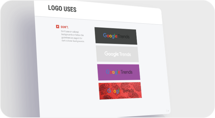 Google Trends Brand Book Page 6 Page 8LOGO USES DON’T. Don’t use on colored backgrounds or follow the guidelines on page 6 for dark colored backgrounds. 7