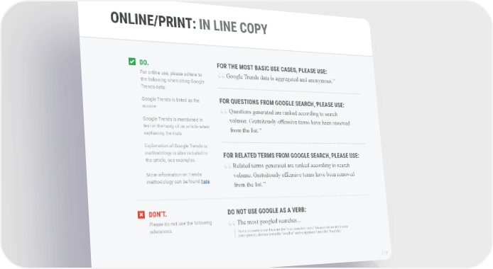 ONLINE/PRINT: IN LINE COPY DO. FOR THE MOST BASIC USE CASES, PLEASE USE: For online use, please adhere to Google Trends data is aggregated and anonymous.” the following when citing Google “ Trends data: Google Trends is listed as the FOR QUESTIONS FROM GOOGLE SEARCH, PLEASE USE: source. “Questions generated are ranked according to search Google Trends is mentioned in volume. Gratuitously offensive terms have been removed text in the body of an article when from the list.” explaining the data. Explanation of Google Trends or methodology is also included in FOR RELATED TERMS FROM GOOGLE SEARCH, PLEASE USE: the article, see examples. Related terms generated are ranked according to search More information on Trends “volume. Gratuitously offensive terms have been removed methodology can be found here. from the list.” DON’T. DO NOT USE GOOGLE AS A VERB: Please do not use the following The most googled searches... references. “It’s not accurate to say these are the “most searched terms” because we are eliminating some generic, obvious terms like “weather” and navigational terms like "YouTube." 17