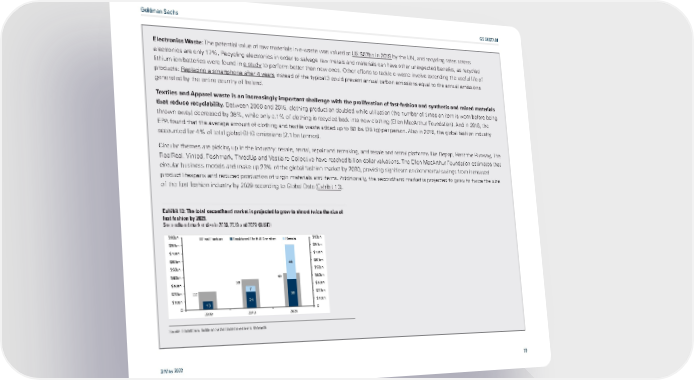 Goldman Sachs GS SUSTAIN Electronics by the UN, and recycling rates across Waste: The potential value of raw materials in e-waste was valued at US $57bn in 2019 electronics are only 17%. Recycling electronics in order to salvage raw metals and materials can have other unexpected benefits, as recycled lithium-ion batteries were found in a study to perform better than new ones. Other efforts to tackle e-waste involve extending the useful life of products: Replacing a smartphone after 4 years instead of the typical 3 could prevent annual carbon emissions equal to the annual emissions generated by the entire country of Ireland. Textiles and Apparel waste is an increasingly important challenge with the proliferation of fast-fashion and synthetic and mixed materials that reduce recyclability. Between 2000 and 2015, clothing production doubled while utilization (the number of times an item is worn before being thrown away) decreased by 36%, while only c.1% of clothing is recycled back into new clothing (Ellen MacArthur Foundation). And in 2018, the EPA found that the average amount of clothing and textile waste added up to 80 lbs (36 kg) per person. Also in 2018, the global fashion industry accounted for 4% of total global GHG emissions (2.1 bn tonnes). Circular themes are picking up in the industry: resale, rental, repair and remaking, and resale and rental platforms like Depop, Rent the Runway, The RealReal, Vinted, Poshmark, ThredUp and Vestiaire Collective have reached billion-dollar valuations. The Ellen MacArthur Foundation estimates that circular business models and make up 23% of the global fashion market by 2030, providing significant environmental savings from increased product lifespans and reduced production of virgin materials and items. Additionally, the secondhand market is projected to grow to twice the size of the fast fashion industry by 2029 according to Global Data (Exhibit 13). Exhibit 13: The total secondhand market is projected to grow to almost twice the size of fast fashion by 2029. Secondhand market size in 2009, 2019 and 2029 ($USD) $90bn Fast Fashion Traditional Thrift & Donation Resale $90bn $80bn $80bn $70bn $70bn $60bn 44 $60bn $50bn $50bn $40bn 43 $40bn $30bn 36 $30bn $20bn 7 $20bn 22 36 $10bn 21 $10bn 0 10 0 2009 2019 2029 Source: GlobalData, Goldman Sachs Global Investment Research 3 May 2022 <0