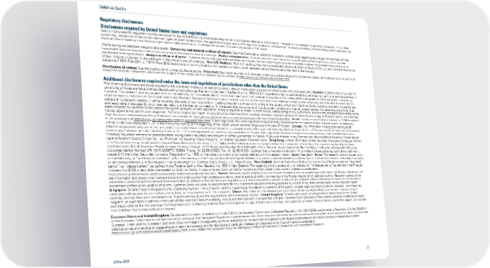 Goldman Sachs Regulatory disclosures Disclosures required by United States laws and regulations See company-specific regulatory disclosures above for any of the following disclosures required as to companies referred to in this report: manager or co-manager in a pending transaction; 1% or other ownership; compensation for certain services; types of client relationships; managed/co-managed public offerings in prior periods; directorships; for equity securities, market making and/or specialist role. Goldman Sachs trades or may trade as a principal in debt securities (or in related derivatives) of issuers discussed in this report. The following are additional required disclosures: Ownership and material conflicts of interest: Goldman Sachs policy prohibits its analysts, professionals reporting to analysts and members of their households from owning securities of any company in the analyst’s area of coverage. Analyst compensation: Analysts are paid in part based on the profitability of Goldman Sachs, which includes investment banking revenues. Analyst as officer or director: Goldman Sachs policy generally prohibits its analysts, persons reporting to analysts or members of their households from serving as an officer, director or advisor of any company in the analyst’s area of coverage. Non-U.S. Analysts: Non-U.S. analysts may not be associated persons of Goldman Sachs & Co. LLC and therefore may not be subject to FINRA Rule 2241 or FINRA Rule 2242 restrictions on communications with subject company, public appearances and trading securities held by the analysts. Distribution of ratings: See the distribution of ratings disclosure above. Price chart: See the price chart, with changes of ratings and price targets in prior periods, above, or, if electronic format or if with respect to multiple companies which are the subject of this report, on the Goldman Sachs website at https://www.gs.com/research/hedge.html. Additional disclosures required under the laws and regulations of jurisdictions other than the United States The following disclosures are those required by the jurisdiction indicated, except to the extent already made above pursuant to United States laws and regulations. Australia: Goldman Sachs Australia Pty Ltd and its affiliates are not authorised deposit-taking institutions (as that term is defined in the Banking Act 1959 (Cth)) in Australia and do not provide banking services, nor carry on a banking business, in Australia. This research, and any access to it, is intended only for “wholesale clients” within the meaning of the Australian Corporations Act, unless otherwise agreed by Goldman Sachs. In producing research reports, members of the Global Investment Research Division of Goldman Sachs Australia may attend site visits and other meetings hosted by the companies and other entities which are the subject of its research reports. In some instances the costs of such site visits or meetings may be met in part or in whole by the issuers concerned if Goldman Sachs Australia considers it is appropriate and reasonable in the specific circumstances relating to the site visit or meeting. To the extent that the contents of this document contains any financial product advice, it is general advice only and has been prepared by Goldman Sachs without taking into account a client’s objectives, financial situation or needs. A client should, before acting on any such advice, consider the appropriateness of the advice having regard to the client’s own objectives, financial situation and needs. A copy of certain Goldman Sachs Australia and New Zealand disclosure of interests and a copy of Goldman Sachs’ Australian Sell- Side Research Independence Policy Statement are available at: https://www.goldmansachs.com/disclosures/australia-new-zealand/index.html. Brazil: Disclosure information in relation to CVM Resolution n. 20 is available at https://www.gs.com/worldwide/brazil/area/gir/index.html. Where applicable, the Brazil-registered analyst primarily responsible for the content of this research report, as defined in Article 20 of CVM Resolution n. 20, is the first author named at the beginning of this report, unless indicated otherwise at the end of the text. Canada: This information is being provided to you for information purposes only and is not, and under no circumstances should be construed as, an advertisement, offering or solicitation by Goldman Sachs & Co. LLC for purchasers of securities in Canada to trade in any Canadian security. Goldman Sachs & Co. LLC is not registered as a dealer in any jurisdiction in Canada under applicable Canadian securities laws and generally is not permitted to trade in Canadian securities and may be prohibited from selling certain securities and products in certain jurisdictions in Canada. If you wish to trade in any Canadian securities or other products in Canada please contact Goldman Sachs Canada Inc., an affiliate of The Goldman Sachs Group Inc., or another registered Canadian dealer. Hong Kong: Further information on the securities of covered companies referred to in this research may be obtained on request from Goldman Sachs (Asia) L.L.C. India: Further information on the subject company or companies referred to in this research may be obtained from Goldman Sachs (India) Securities Private Limited, Research Analyst - SEBI Registration Number INH000001493, 951-A, Rational House, Appasaheb Marathe Marg, Prabhadevi, Mumbai 400 025, India, Corporate Identity Number U74140MH2006FTC160634, Phone +91 22 6616 9000, Fax +91 22 6616 9001. Goldman Sachs may beneficially own 1% or more of the securities (as such term is defined in clause 2 (h) the Indian Securities Contracts (Regulation) Act, 1956) of the subject company or companies referred to in this research report. Japan: See below. Korea: This research, and any access to it, is intended only for “professional investors” within the meaning of the Financial Services and Capital Markets Act, unless o