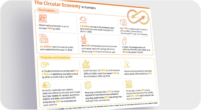 The Circular Economy in Numbers The Problem… Global waste generation is set to 1.6 billion tonnes of CO2 emissions were Over 70% of global waste is disposed increase 70%by 2050 generated from solid waste management of in landfills, 33% of which is alone in 2016 mismanaged through ‘open dumping’ 11 million metric tonnes of plastic Up to40% of food produced in the US ends In 2018, the average amount of were leaked into the ocean in 2016 up as waste, while the average UK family clothing and textile waste added up to throws away £720 worth of food per year 80 lbs per person in the US Progress and Solutions A Circular Economy could help add $4.5 Landfilled waste fell 58%in the EU between Circular economy solutions could help trillion in additional economic output 1995 and 2020, while it increased 0.6% in reduce global GHG emissions by 39% by 2030 and $25 trillion by 2050 the US between 1990 and 2018 In the EU, materials recirculation, materials efficiency increase and circular Recycling cardboard takes 75%of energy On average, it costs 44%less to business models for cement, aluminium, required to manufacture new cardboard; recycle trash than send it to landfills, plastics and steel could reduce CO2 recycling plastic takes 84%less energy than and 54% -60% less to recycle trash emissions by 56%vs a business-as- making it from raw materials than to incinerate it usual scenario Sources: World Bank, Pew Charitable Trusts, Dept. for Environment Food & Rural Affairs, Ellen MacArthur Foundation, Waste to Wealth, Eurostat, EPA, Circle Economy, Recycling Revolution, data compiled by Goldman Sachs Global Investment Research