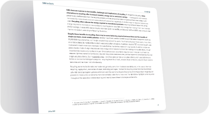 Goldman Sachs GS SUSTAIN Still, there are nuances to the benefits, challenges and implications of recycling. In the path to circularity, many alternatives to recycling offer increased material, energy and or emissions savings — reusing goods and materials prevents any inefficiencies from the recycling process, and reducing consumption of goods and services to begin with minimises the material and emissions associated with production, regardless of whether virgin or recycled materials are used. Recycling often reduces the energy required to manufacture products: recycling cardboard takes 75% of the energy required to manufacture new cardboard; recycling plastic takes 84% less energy than making it from raw materials. And on average, it costs 44% less to recycle trash than send it to landfills, and between 54% and 60% less to recycle trash than to incinerate it, according to Recycling Revolution. Despite these benefits to recycling, there may be some balancing required between these and the benefits of single-use items, most notably plastics. Sending 1kg of food waste to landfill has a similar carbon footprint to landfilling 25,000 500ml plastic bottles, so if single-use plastic can extend the useful life of food and prevent food waste, it can often, 4 on a relative basis, be net beneficial to both waste and carbon emissions. In addition, recycled PET, in a recent study , was discovered to leach more toxic chemicals into water bottles than bottles made with virgin plastic. In addition, single-use plastic bottles made of virgin materials are less energy and emissions intensive than making one reusable bottle, though these benefits reverse after sufficient reuse. One stainless steel water bottle requires seven times as much fossil fuel, releases 14 times more GHG emissions, requires many more metal resources, and has higher risk to biodiversity than one single-use plastic bottle. But if reused 50 times, it is climate positive relative to a plastic bottle, and if used 500 times is better on environmental-impact categories - requiring fewer fossil fuels, releases fewer emissions, requires fewer material resources and has lower risk to biodiversity. Recycling economic bottlenecks and headwinds generally come from feedstock availability and, in the case of chemical recycling, supply chain, economies of scale, technology and capex. Demand for recycling comes from the downstream tailwinds (social perception, policies and incentives) that over time should offset some of the headwinds in the production process to make a circular economy more economically viable than a linear one. The table below highlights some key areas throughout the value chain where recycling and linearity have different challenges and benefits. 4 Gerassimidou, S., Lanska, P., Hahladakis, J., Lovat, E., Vanzetto, S., Geueke, B., Groh, K., Muncke, J., Maffini, M., Martin, O., Iacovidou, E.. (2022). Unpacking the complexity of the PET drink bottles value chain: A chemicals perspective. 10.1016/j.hazmat.2022.128410. 3 May 2022 <7