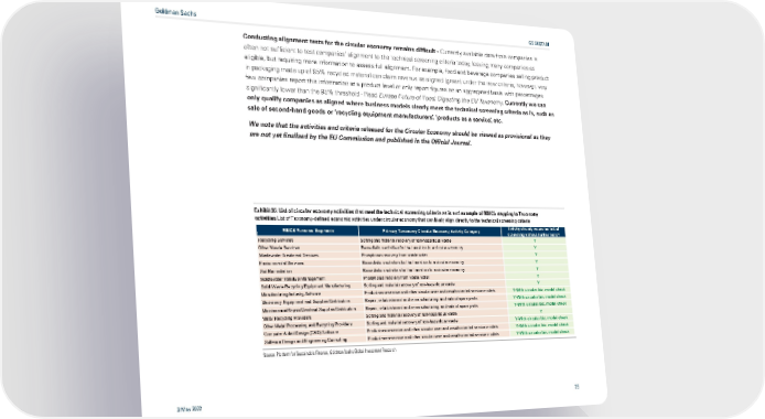 Goldman Sachs GS SUSTAIN Conducting alignment tests for the circular economy remains difficult - Currently available data from companies is often not sufficient to test companies’ alignment to the technical screening criteria today, leaving many companies as eligible, but requiring more information to assess full alignment. For example, food and beverage companies selling product in packaging made up of 95% recycled material can claim revenue as aligned (green) under the new criteria; however, very few companies report this information at a product level or only report figures on an aggregated basis with percentages significantly lower than the 95% threshold - Read Europe Future of Food: Digesting the EU Taxonomy. Currently we can only qualify companies as aligned where business models clearly meet the technical screening criteria as is, such as sale of second-hand goods or ‘recycling equipment manufacturers, ‘products as a service, etc. We note that the activities and criteria released for the Circular Economy should be viewed as provisional as they are not yet “nalised by the EU Commission and published in the Of“cial Journal. Exhibit 26: List of circular economy activities that meet the technical screening criteria as is and example of RBICS mapping to Taxonomy activities List of Taxonomy-defined economic activities under circular economy that can likely align directly to the technical screening criteria RBICS Revenue Segments Primary Taxonomy Circular Economy Activity Category Activity already meets technical screening without further tests? Recycling Services Sorting and material recovery of non-hazardous waste Y Other Waste Services Remediation activities for the transition to a circular economy Y Wastewater Treatment Services Phosphorus recovery from waste water Y Environmental Services Remediation activities for the transition to a circular economy Y Soil Remediation Remediation activities for the transition to a circular economy Y Wastewater Residual Management Phosphorus recovery from waste water Y Solid Waste Recycling Equipment Manufacturing Sorting and material recovery of non-hazardous waste Y Manufacturing Industry Software Product-as-a-service and other circular use- and result-oriented service models Y-With circular biz. model check Machinery, Equipment and Supplies Distributors Repair, refurbishment and remanufacturing, and sale of spare parts Y-With circular biz. model check Maintenance/Repair/Overhaul Supplies Distributors Repair, refurbishment and remanufacturing, and sale of spare parts Y-With circular biz. model check Metal Recycling Providers Sorting and material recovery of non-hazardous waste Y Other Metal Processing and Recycling Providers Sorting and material recovery of non-hazardous waste Y-With circular biz. model check Computer Aided Design (CAD) Software Product-as-a-service and other circular use- and result-oriented service models Y-With circular biz. model check Software Design and Engineering Consulting Product-as-a-service and other circular use- and result-oriented service models Y-With circular biz. model check Source: Platform for Sustainable Finance, Goldman Sachs Global Investment Research 3 May 2022 25