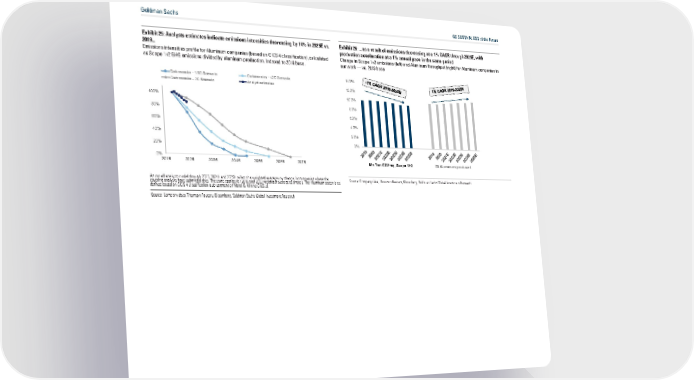 Goldman Sachs GS SUSTAIN: ESG of the Future Exhibit 25: Analysts estimates indicate emissions intensities decreasing by 14% in 2025E vs. Exhibit 26: ...as a result of emissions decreasing at a 1% CAGR through 2025E, with 2019... production acceleration at a 1% annual pace in the same period Emissions intensities profile for Aluminum companies (based on GICS 4 classification), calculated Change in Scope 1+2 emissions (left) and Aluminum throughput (right) for Aluminum companies in as Scope 1+2 GHG emissions divided by aluminum production. Indexed to 2019 base. our work — vs. 2019 base Carbonomics - 1.5C Scenario Carbonomics - <2C Scenario 140% Carbonomics - 2C Scenario Analyst estimates 120% 100% 100% 80% 80% 60% 60% 40% 40% 20% 20% 0% 0% 2015 2025 2035 2045 2055 2065 2075 Mn Ton CO2-eq, Scope 1+2 Gt Aluminum produced As not all analysts model through 2025, 2024E and 2025E reflect the weighted average yoy change for companies where the Source: Company data, Thomson Reuters, Bloomberg, Goldman Sachs Global Investment Research covering analysts have submitted data. The same applies for 2019 and 2020 weighted average estimates. The Aluminum sector is as de“ned based on GICS 4 classi“cation (sub-segment of Metal & Mining GICS 3). Source: Company data, Thomson Reuters, Bloomberg, Goldman Sachs Global Investment Research