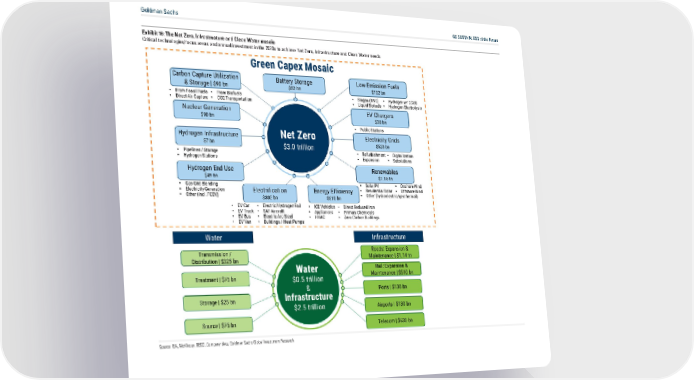 Goldman Sachs GS SUSTAIN: ESG of the Future Exhibit 16: The Net Zero, Infrastructure and Clean Water mosaic Critical technologies/focus areas and annual investment in the 2020s to achieve Net Zero, Infrastructure and Clean Water needs Source: IEA, McKinsey, OECD, Company data, Goldman Sachs Global Investment Research