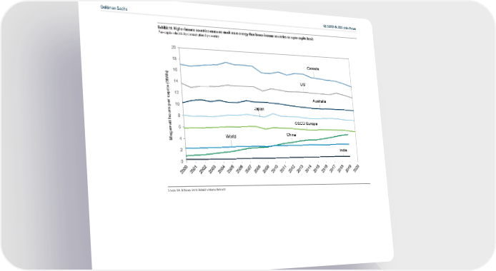 Goldman Sachs GS SUSTAIN: ESG of the Future Exhibit 11: Higher-income countries consume much more energy than lower-income countries on a per-capita basis Per-capita electricity consumption by country 20 18 Canada Wh)16 (M14 US capita 12 Australia per 10 Japan ours 8 h OECD Europe tt wa 6 ga China e 4 World M 2 India 0 Source: IEA, Goldman Sachs Global Investment Research