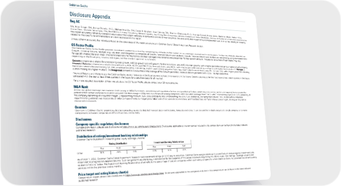 Goldman Sachs Disclosure Appendix Reg AC We, Brian Singer, CFA, Enrico Chinello, Ph.D., Michael Hao Wu, CFA, Derek R. Bingham, Evan Tylenda, CFA, Sharmini Chetwode, Ph.D., Brendan Corbett, Emma Jones, Madeline Meyer, Keebum Kim, Grace Chen, Michele Della Vigna, CFA, Neil Mehta, Umang Choudhary, Michael Lapides, Joy Zhang, Nina Dergunova, Alberto Gandolfi and Pedro Manfredini, hereby certify that all of the views expressed in this report accurately reflect our personal views about the subject company or companies and its or their securities. We also certify that no part of our compensation was, is or will be, directly or indirectly, related to the specific recommendations or views expressed in this report. Unless otherwise stated, the individuals listed on the cover page of this report are analysts in Goldman Sachs Global Investment Research division. GS Factor Profile The Goldman Sachs Factor Profile provides investment context for a stock by comparing key attributes to the market (i.e. our coverage universe) and its sector peers. The four key attributes depicted are: Growth, Financial Returns, Multiple (e.g. valuation) and Integrated (a composite of Growth, Financial Returns and Multiple). Growth, Financial Returns and Multiple are calculated by using normalized ranks for specific metrics for each stock. The normalized ranks for the metrics are then averaged and converted into percentiles for the relevant attribute. The precise calculation of each metric may vary depending on the fiscal year, industry and region, but the standard approach is as follows: Growth is based on a stocks forward-looking sales growth, EBITDA growth and EPS growth (for financial stocks, only EPS and sales growth), with a higher percentile indicating a higher growth company. Financial Returns is based on a stocks forward-looking ROE, ROCE and CROCI (for financial stocks, only ROE), with a higher percentile indicating a company with higher financial returns. Multiple is based on a stocks forward-looking P/E, P/B, price/dividend (P/D), EV/EBITDA, EV/FCF and EV/Debt Adjusted Cash Flow (DACF) (for financial stocks, only P/E, P/B and P/D), with a higher percentile indicating a stock trading at a higher multiple. The Integrated percentile is calculated as the average of the Growth percentile, Financial Returns percentile and (100% - Multiple percentile). Financial Returns and Multiple use the Goldman Sachs analyst forecasts at the fiscal year-end at least three quarters in the future. Growth uses inputs for the fiscal year at least seven quarters in the future compared with the year at least three quarters in the future (on a per-share basis for all metrics). For a more detailed description of how we calculate the GS Factor Profile, please contact your GS representative. M&A Rank Across our global coverage, we examine stocks using an M&A framework, considering both qualitative factors and quantitative factors (which may vary across sectors and regions) to incorporate the potential that certain companies could be acquired. We then assign a M&A rank as a means of scoring companies under our rated coverage from 1 to 3, with 1 representing high (30%-50%) probability of the company becoming an acquisition target, 2 representing medium (15%-30%) probability and 3 representing low (0%-15%) probability. For companies ranked 1 or 2, in line with our standard departmental guidelines we incorporate an M&A component into our target price. M&A rank of 3 is considered immaterial and therefore does not factor into our price target, and may or may not be discussed in research. Quantum Quantum is Goldman Sachs proprietary database providing access to detailed financial statement histories, forecasts and ratios. It can be used for in-depth analysis of a single company, or to make comparisons between companies in different sectors and markets. Disclosures Company-specific regulatory disclosures Compendium report: please see disclosures at https://www.gs.com/research/hedge.html. Disclosures applicable to the companies included in this compendium can be found in the latest relevant published research Distribution of ratings/investment banking relationships Goldman Sachs Investment Research global Equity coverage universe Rating Distribution Investment Banking Relationships Buy Hold Sell Buy Hold Sell Global 50% 35% 15% 65% 57% 45% As of April 1, 2022, Goldman Sachs Global Investment Research had investment ratings on 3,143 equity securities. Goldman Sachs assigns stocks as Buys and Sells on various regional Investment Lists; stocks not so assigned are deemed Neutral. Such assignments equate to Buy, Hold and Sell for the purposes of the above disclosure required by the FINRA Rules. See ‘Ratings, Coverage universe and related definitions below. The Investment Banking Relationships chart reflects the percentage of subject companies within each rating category for whom Goldman Sachs has provided investment banking services within the previous twelve months. Price target and rating history chart(s) Compendium report: please see disclosures at https://www.gs.com/research/hedge.html. Disclosures applicable to the companies included in this compendium can be found in the latest relevant published research